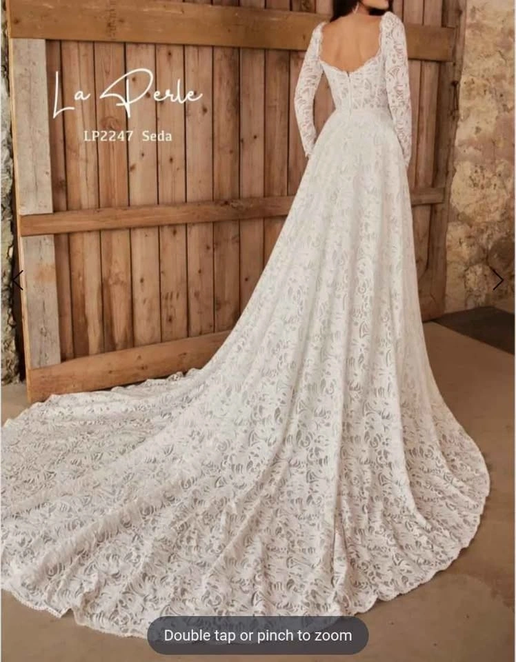 La Perle A-Line dress with sleeves. Bridal size 12. I wear a size 10. I am 5'7" and wore 3" heels. No alterations to dress, a bustle is attached that is 3 pearls above the bum that can be removed if needed. Worn but professional dry cleaned.