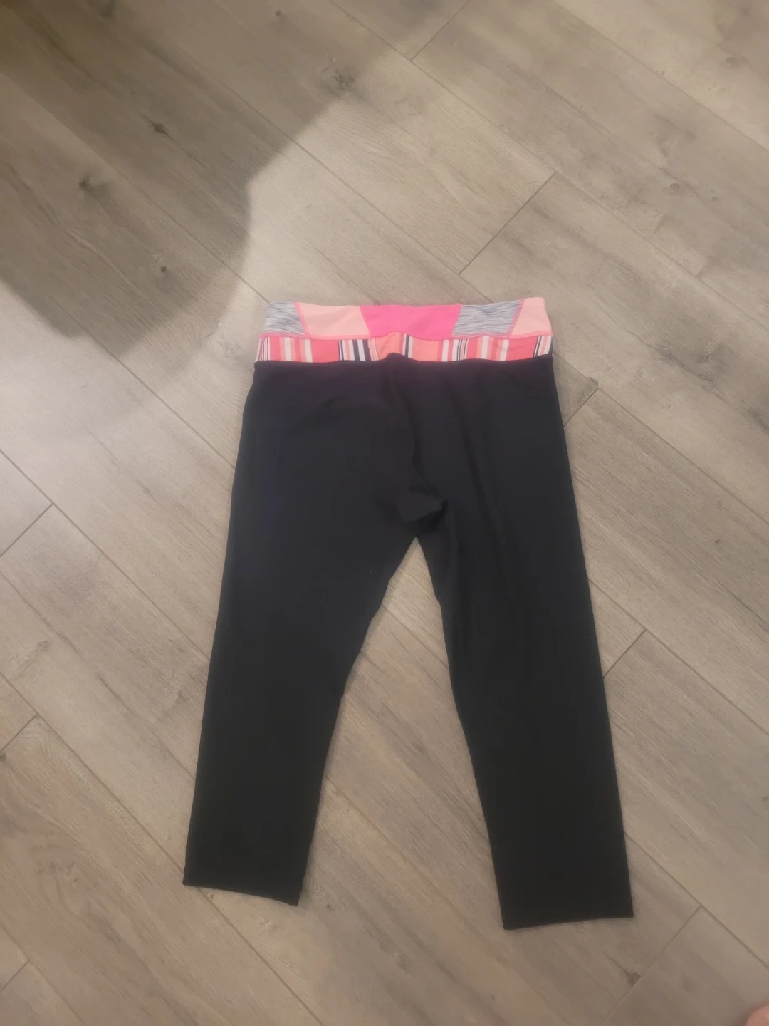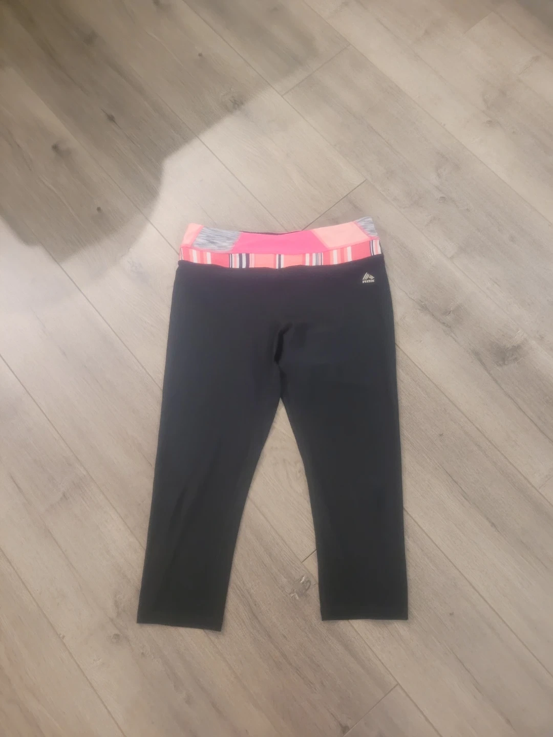 RBX black capri leggings with a colourful striped waistband. These comfortable capris are made for active wear. Size is medium.