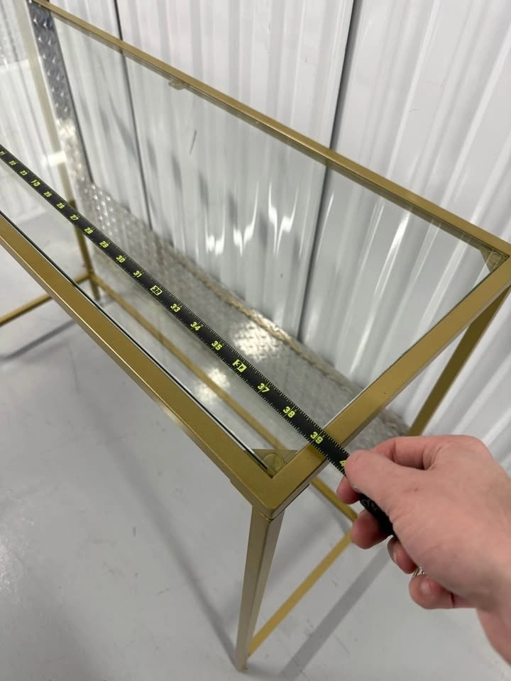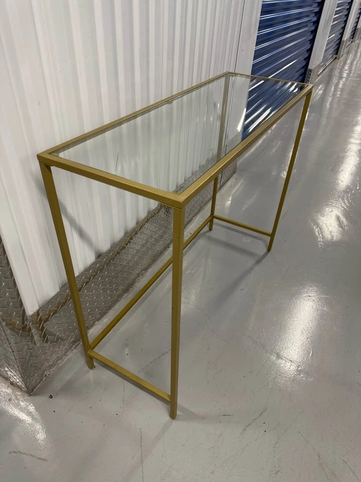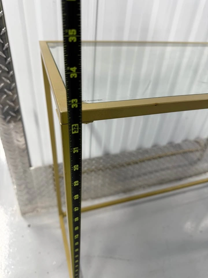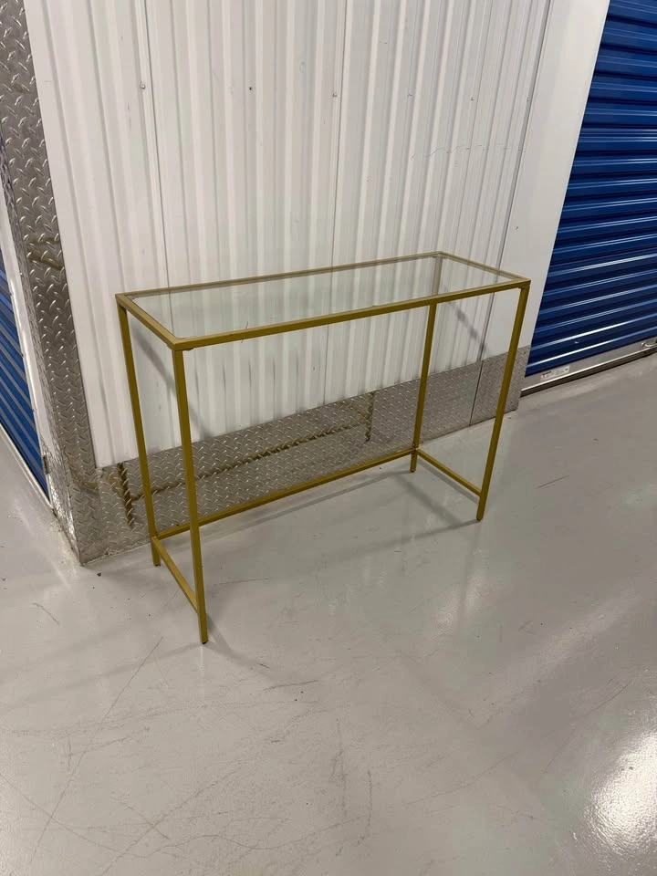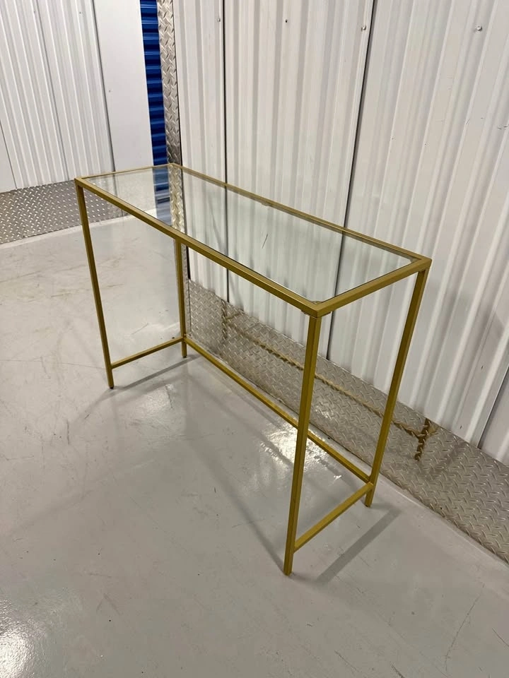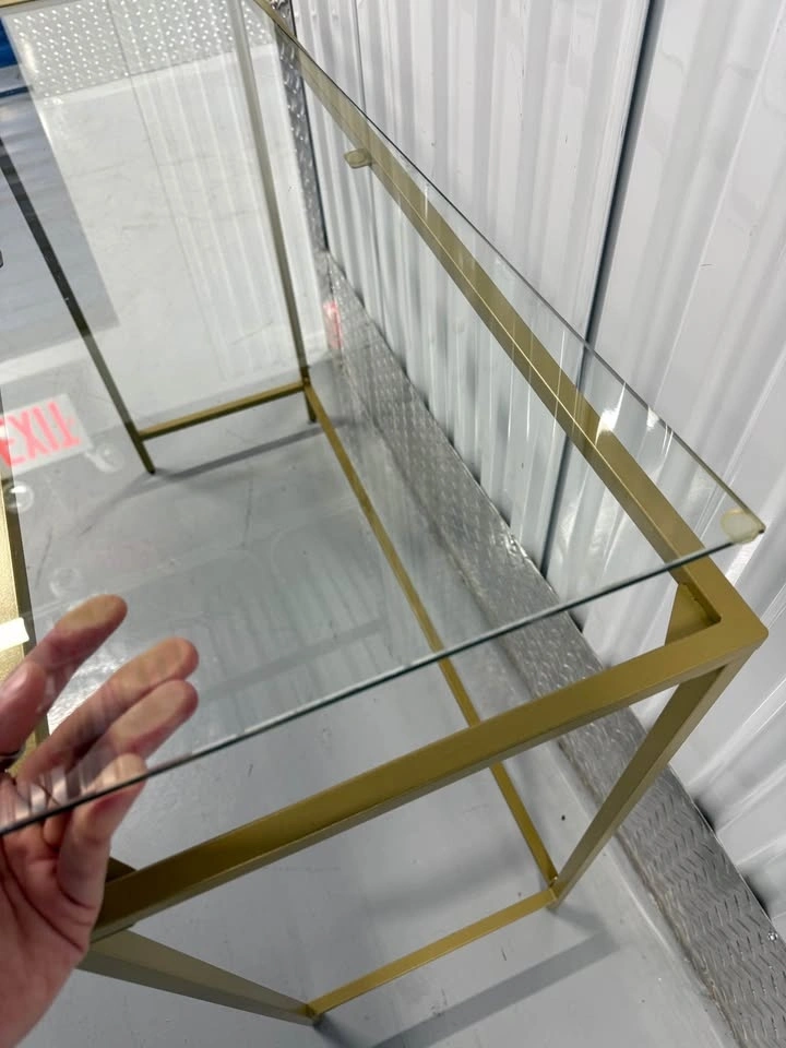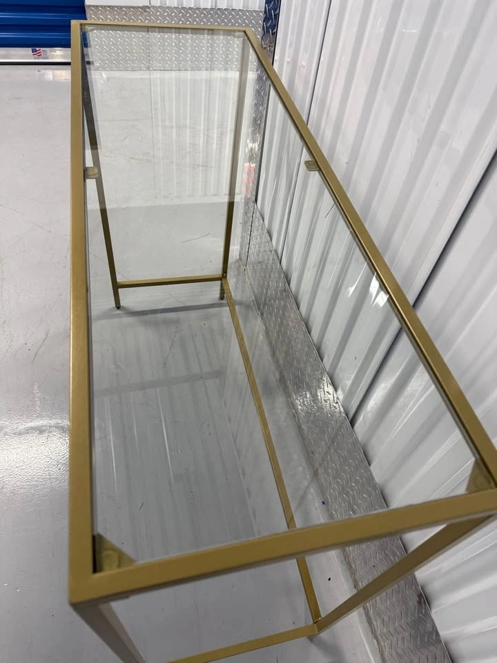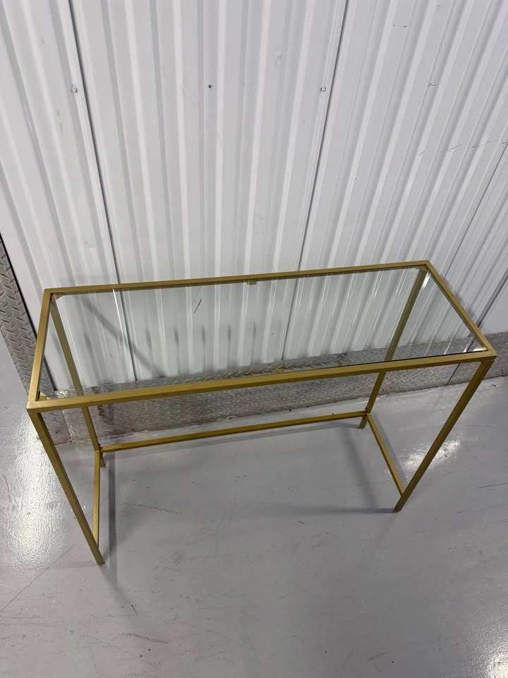 Beautiful modern gold metal console table with a clear tempered glass top. Sleek, minimal design that works perfectly in hallways, entryways, behind couches, or as a vanity/display shelf.