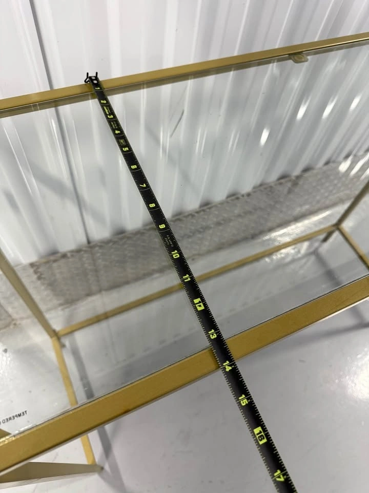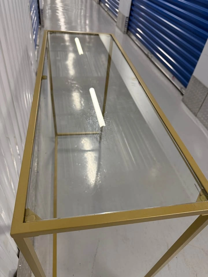 Beautiful modern gold metal console table with a clear tempered glass top. Sleek, minimal design that works perfectly in hallways, entryways, behind couches, or as a vanity/display shelf.