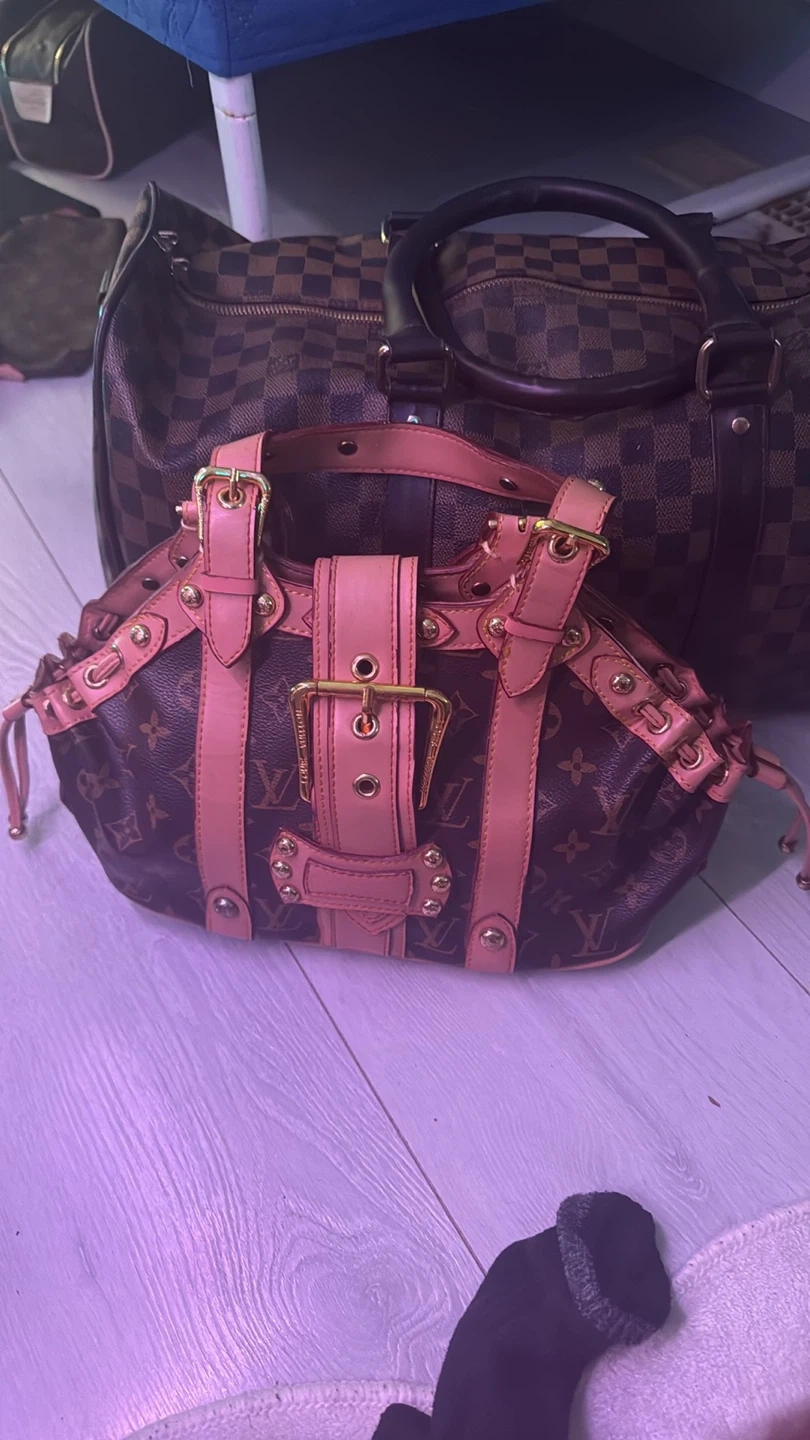 A stylish Louis Vuitton shoulder bag in the classic monogram canvas. It features a pink leather trim and gold-tone hardware. This bag is perfect for everyday use.