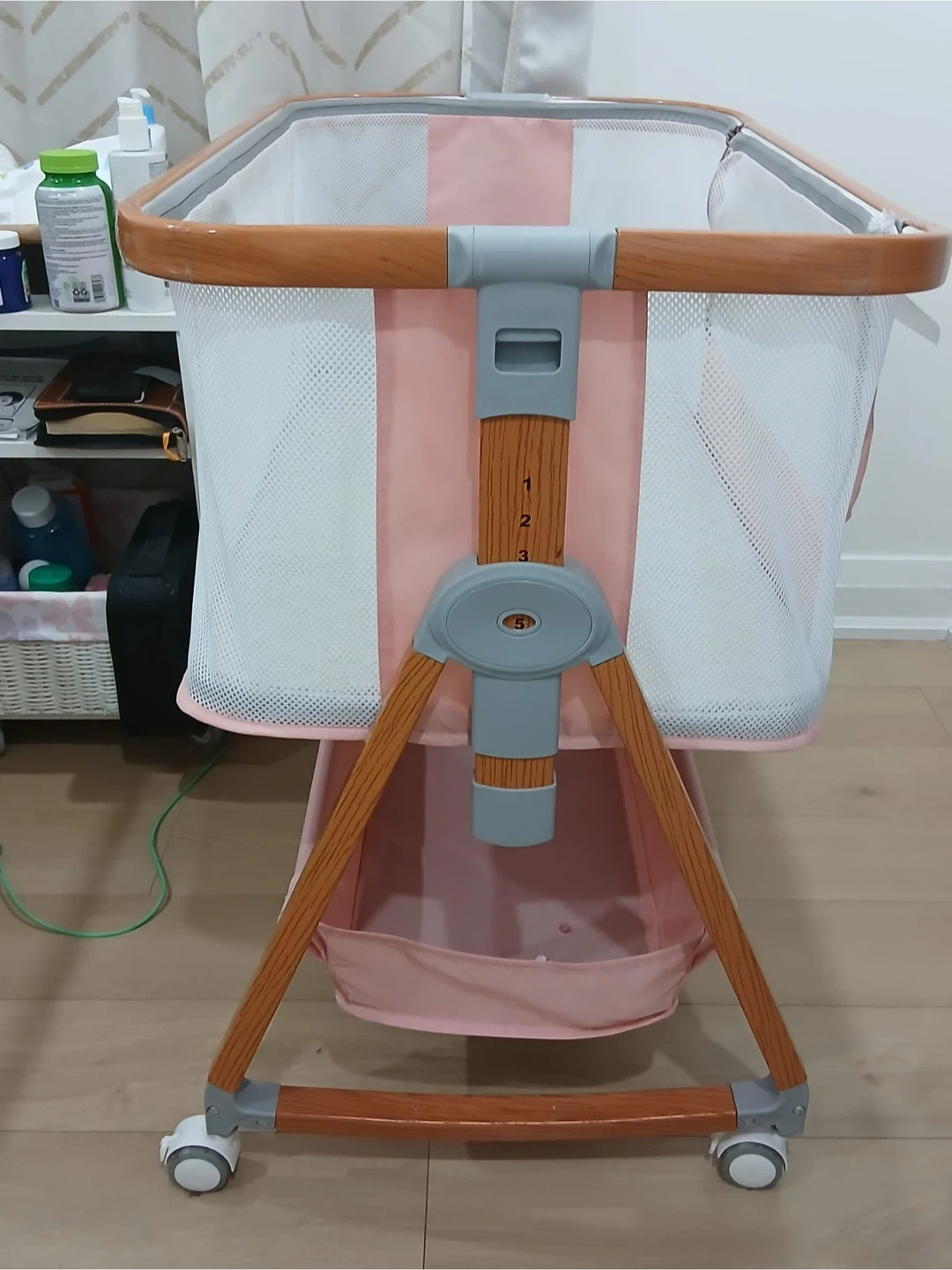 This bedside bassinet is a convenient sleeping solution for your little one. It's designed with mesh sides for good airflow and has a handy storage basket underneath. The height is adjustable to match your bed.