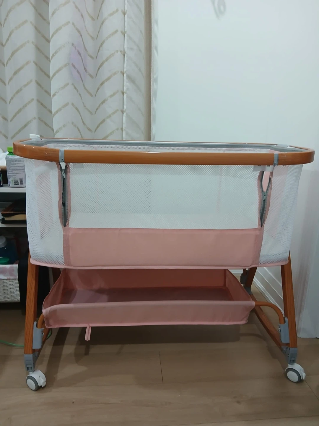 This bedside bassinet is a convenient sleeping solution for your little one. It's designed with mesh sides for good airflow and has a handy storage basket underneath. The height is adjustable to match your bed.