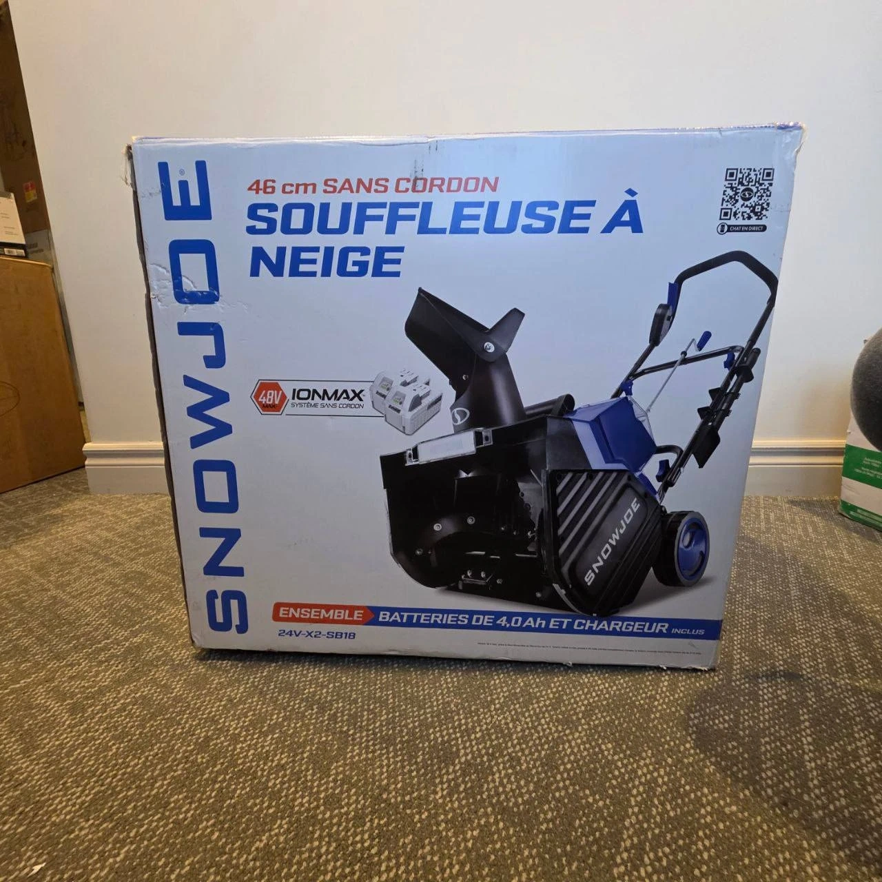 Brand new Snow Joe 48V Cordless Snow Blower Kit (24V-X2-SB18) with 2x 4Ah batteries, dual-port charger, and LED headlight. 18” clearing path, heavy-duty and powerful for driveways, patios, and sidewalks. Convenient, cordless, and easy to use for winter snow removal.