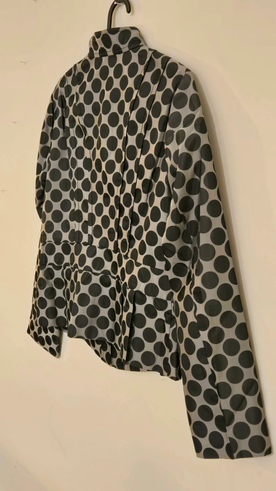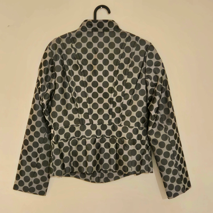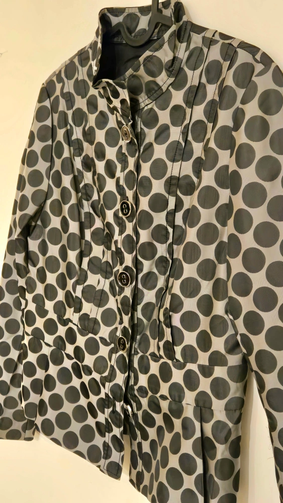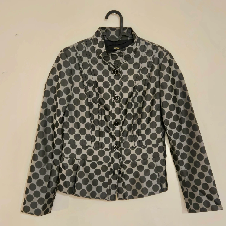 Women's blazer with a black and grey polka dot pattern. It has a mandarin collar and buttons down the front. It is a fitted style with a slight peplum at the waist. The blazer is fully lined.