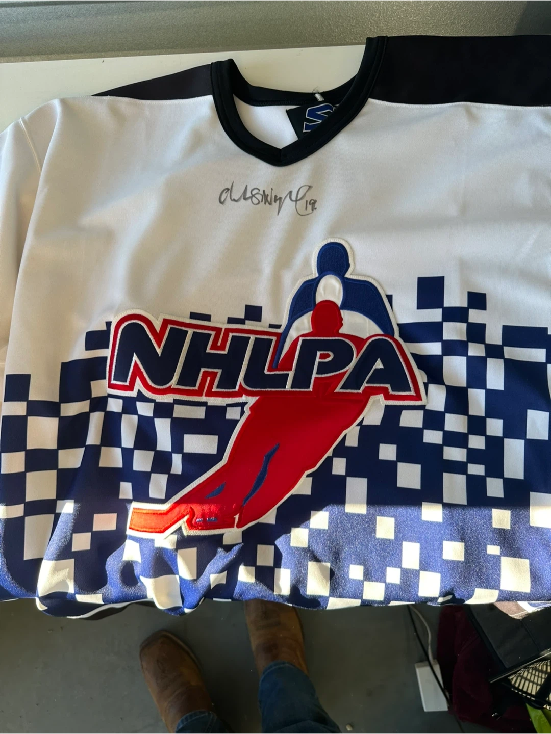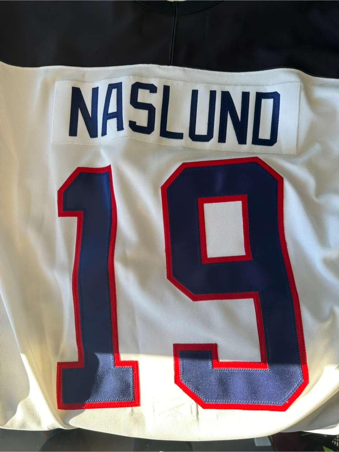 This is a PRO 52 hockey jersey featuring signed Markus Naslund and the number 19. It's made of 100% polyester. The jersey also has the NHLPA logo on the front. Been in storage for about 24 years