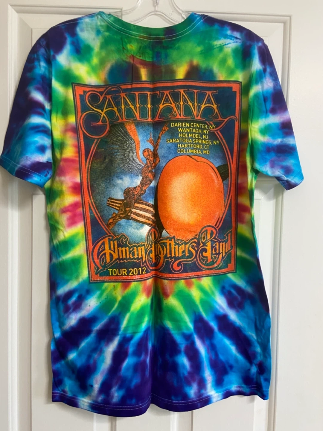 This is a Nike tie-dye t-shirt featuring Santana and The Allman Brothers Band from their 2012 tour. It's a standard fit, size medium. The shirt showcases a vibrant tie-dye pattern with concert graphics on both sides.