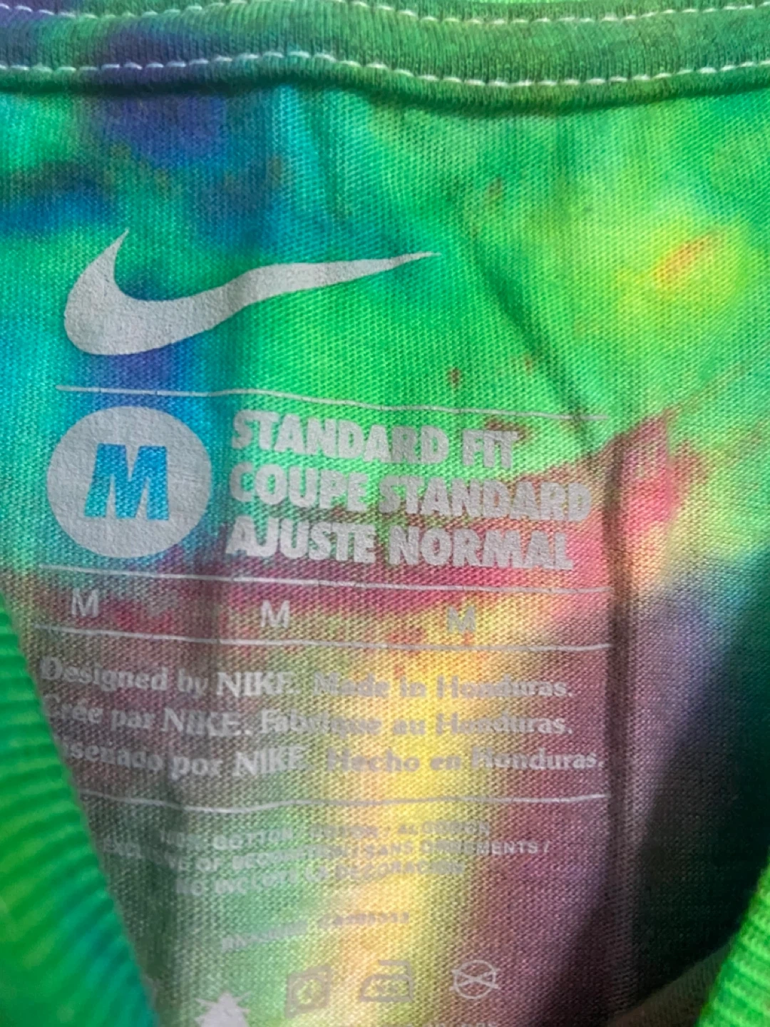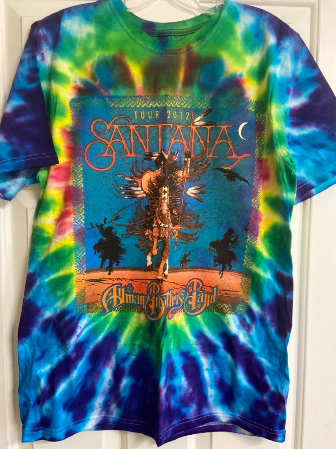 This is a Nike tie-dye t-shirt featuring Santana and The Allman Brothers Band from their 2012 tour. It's a standard fit, size medium. The shirt showcases a vibrant tie-dye pattern with concert graphics on both sides.