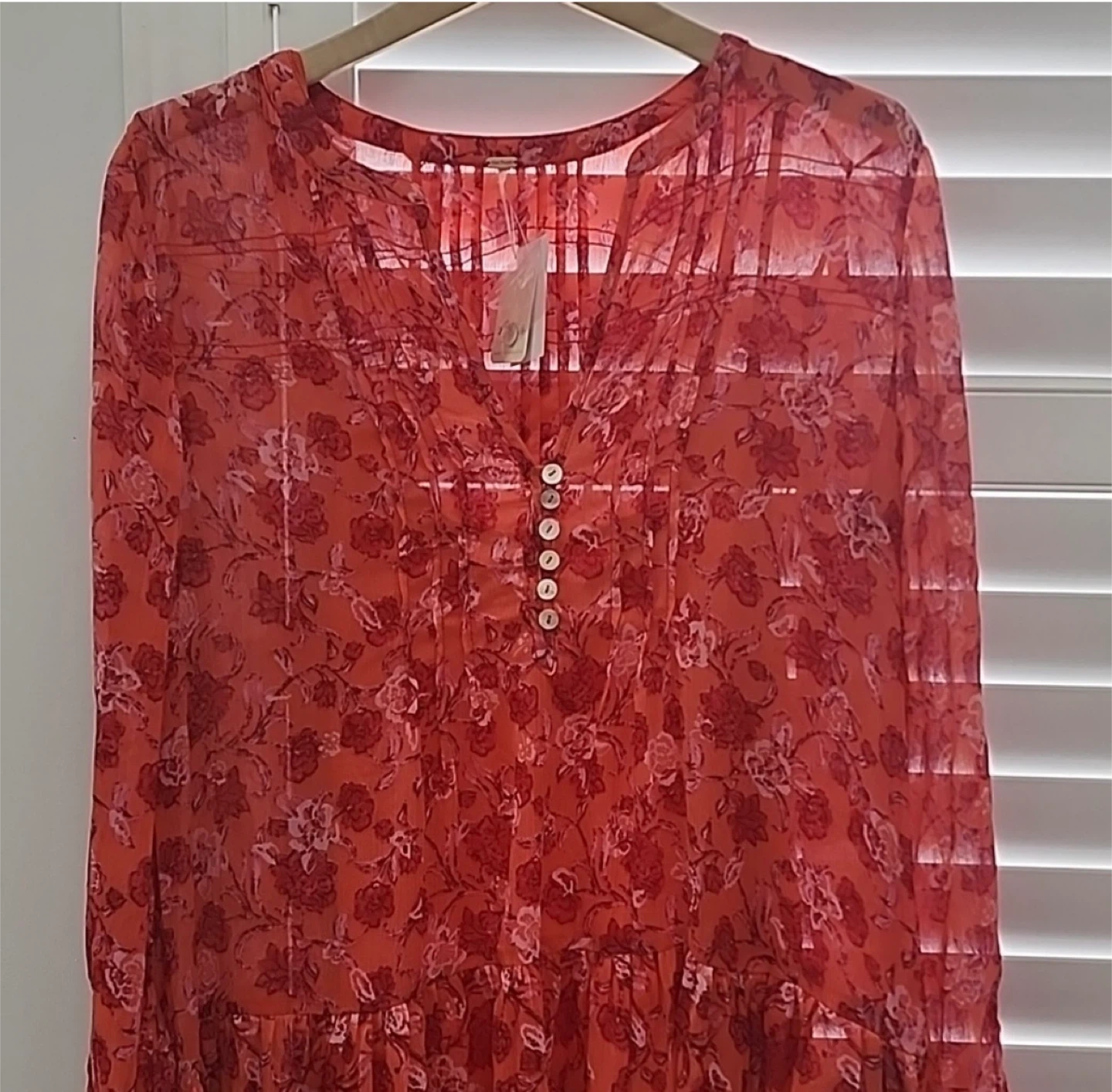 Coral and pink floral print maxi dress by Free People. It's a size large with a V-neck and button detailing. Measures approximately 54 inches in length and 22 inches pit to pit. Includes a separate slip.