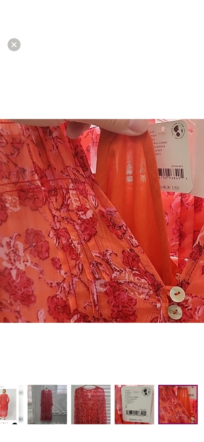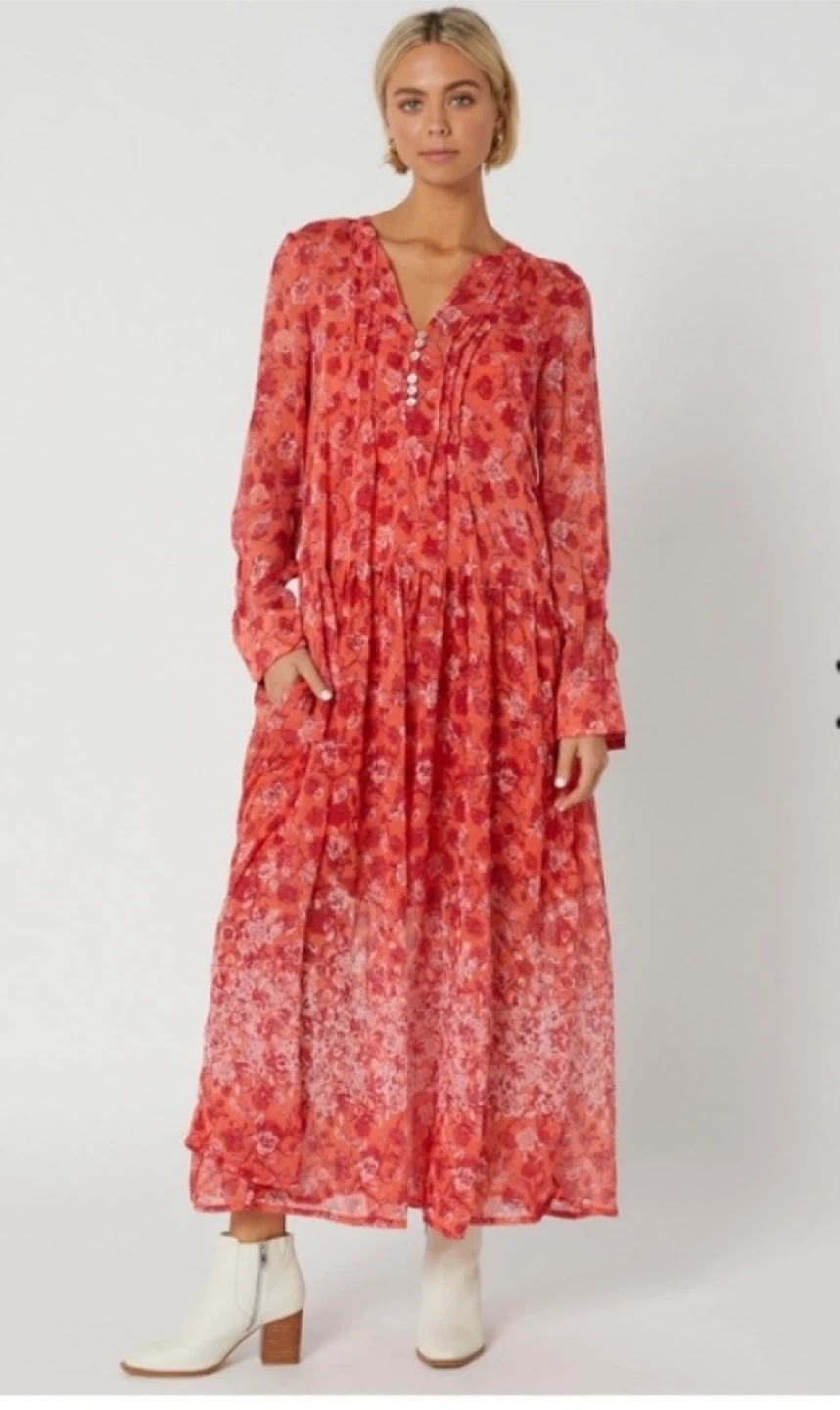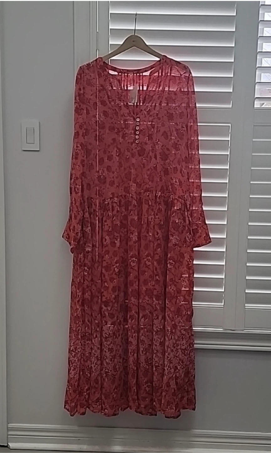 Coral and pink floral print maxi dress by Free People. It's a size large with a V-neck and button detailing. Measures approximately 54 inches in length and 22 inches pit to pit. Includes a separate slip.