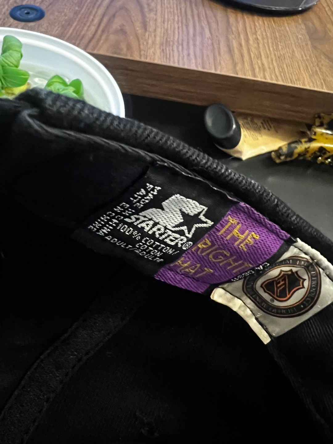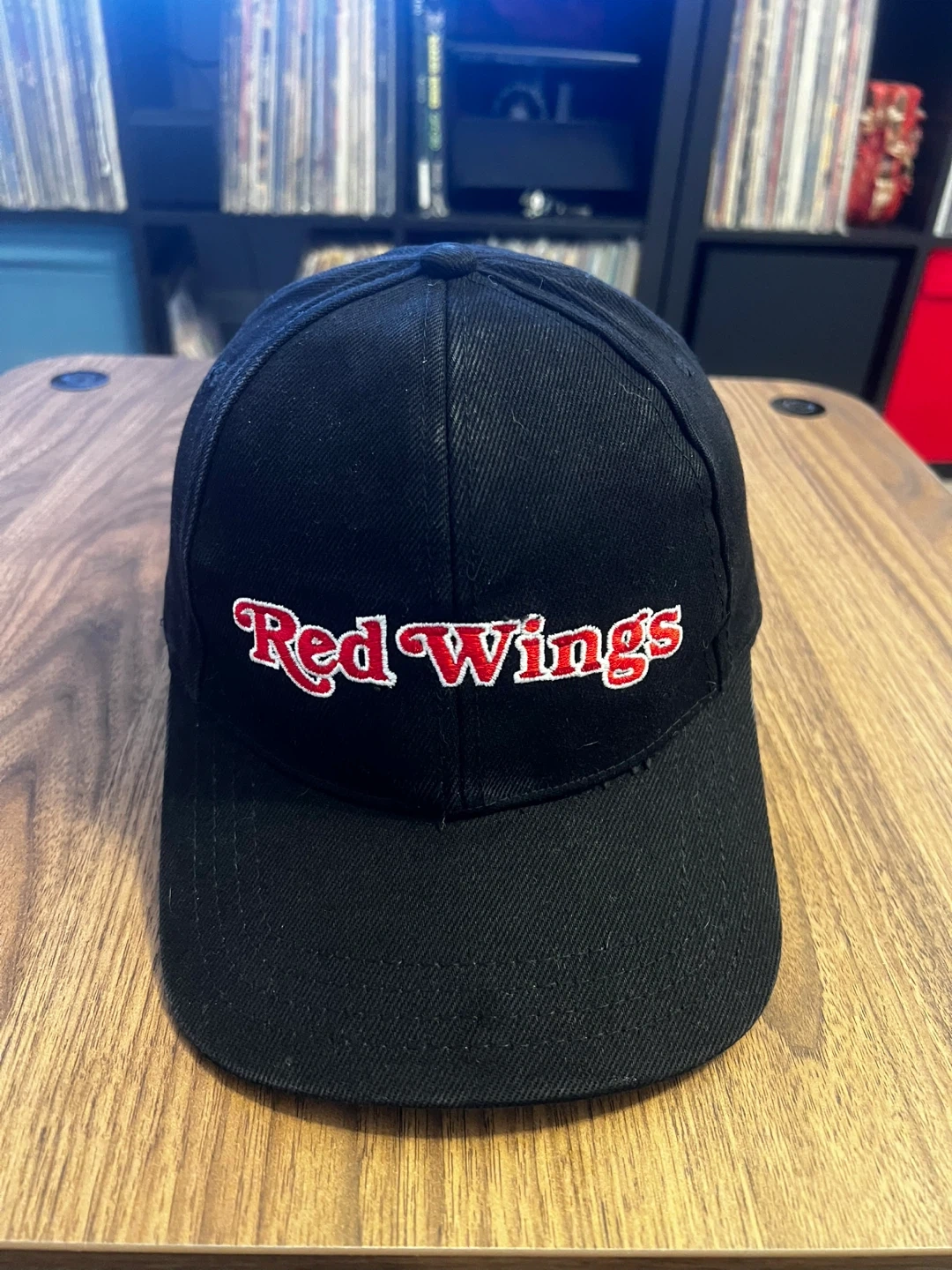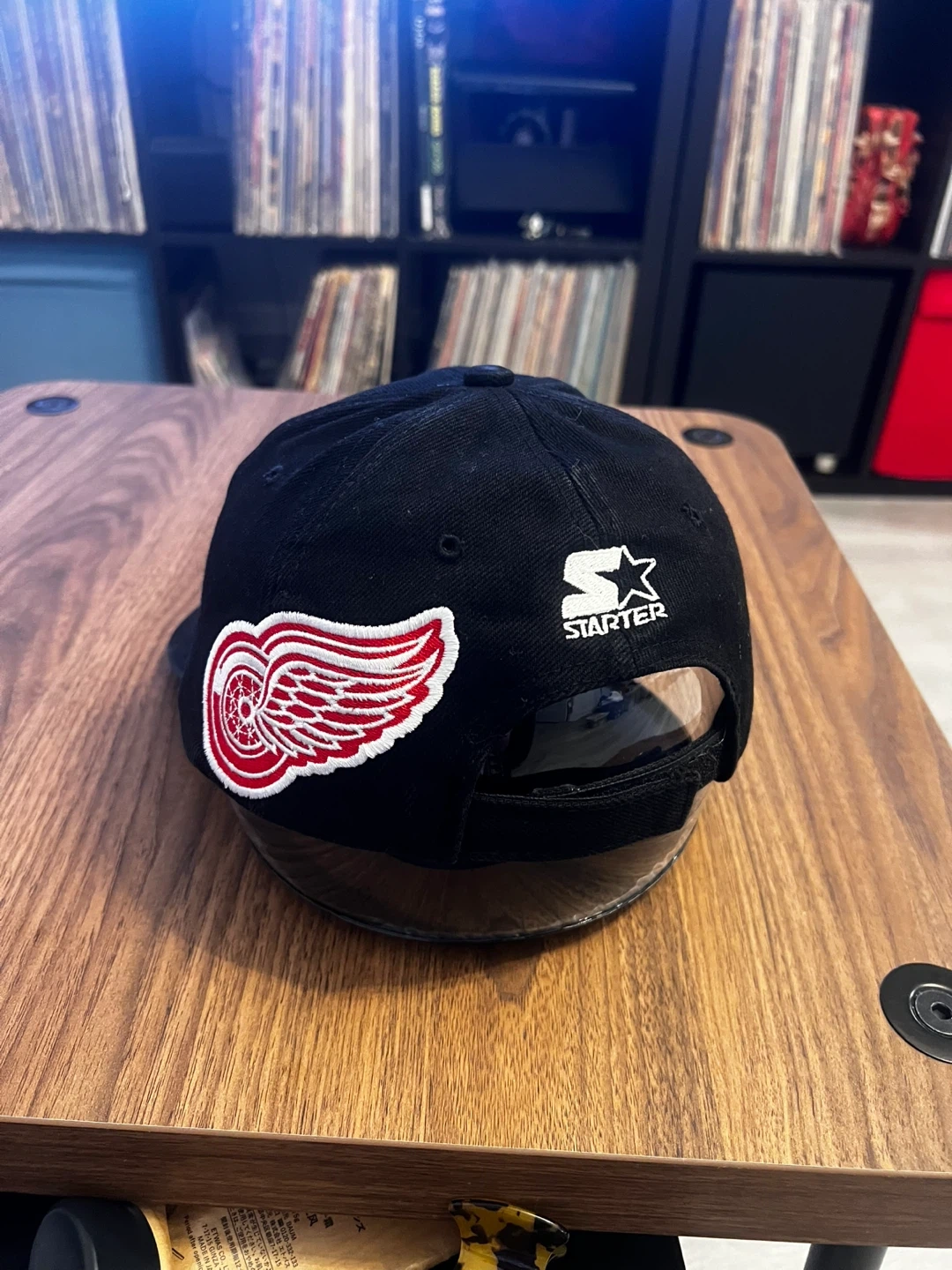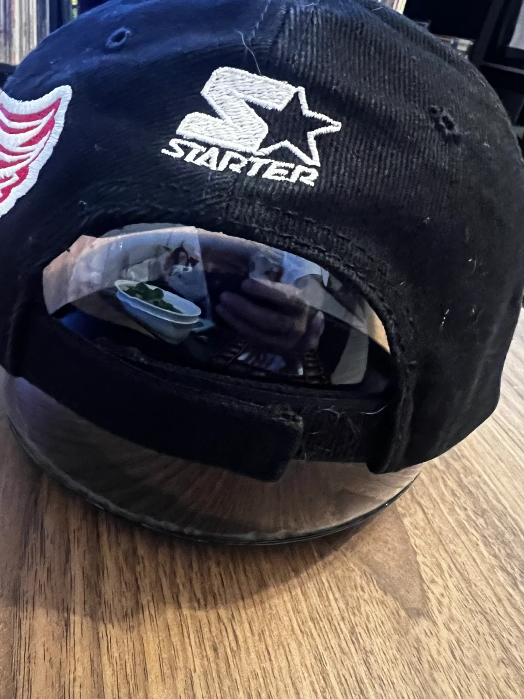 This is a black Detroit Red Wings baseball cap with embroidered logos. It's made with 100% cotton and is a size adult. Shows the Starter brand logo on the back.
