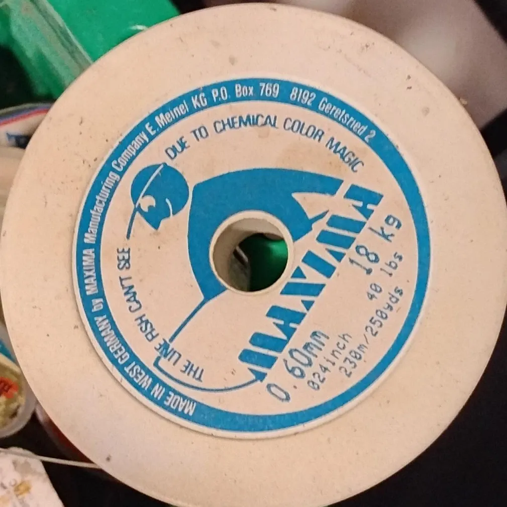 Maxima fishing line from West Germany. This line has a diameter of 0.60mm and a strength of 18 kg (40 lbs). It's 230m/250yds long. The line is due to chemical color magic.