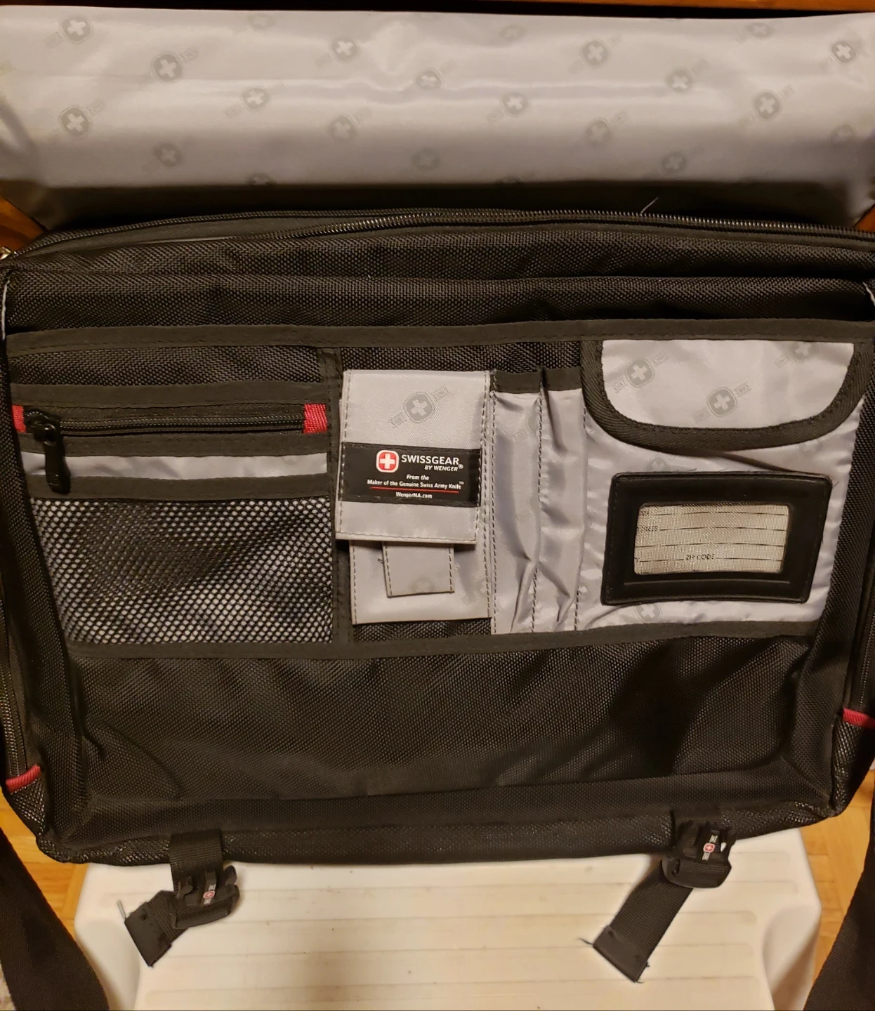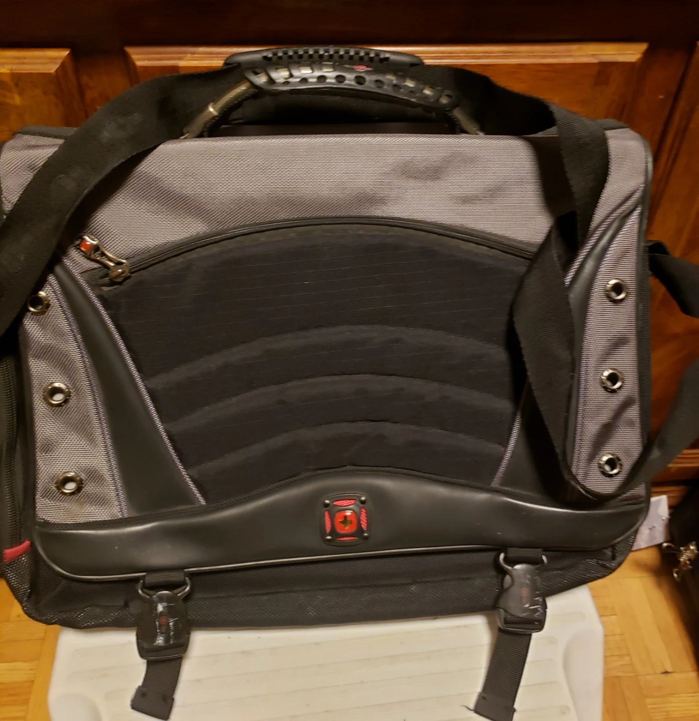 This Swiss Gear messenger bag is grey and black. It's got multiple compartments for organization. Measures approximately 17 inches wide.
