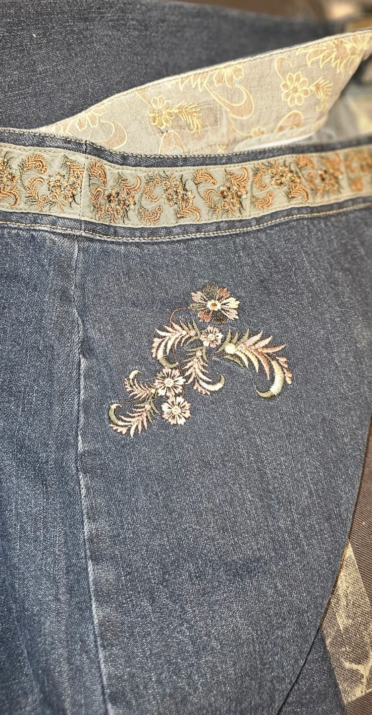 A dark wash denim skirt with embroidered floral detailing along the waistband and front panels. It has a zippered closure and a subtle back slit. Like brand new. Gently warn few times. Material is denim.