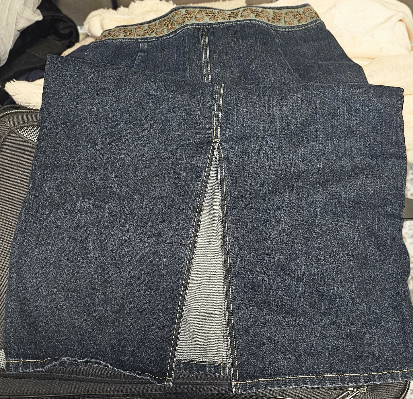 A dark wash denim skirt with embroidered floral detailing along the waistband and front panels. It has a zippered closure and a subtle back slit. Like brand new. Gently warn few times. Material is denim.