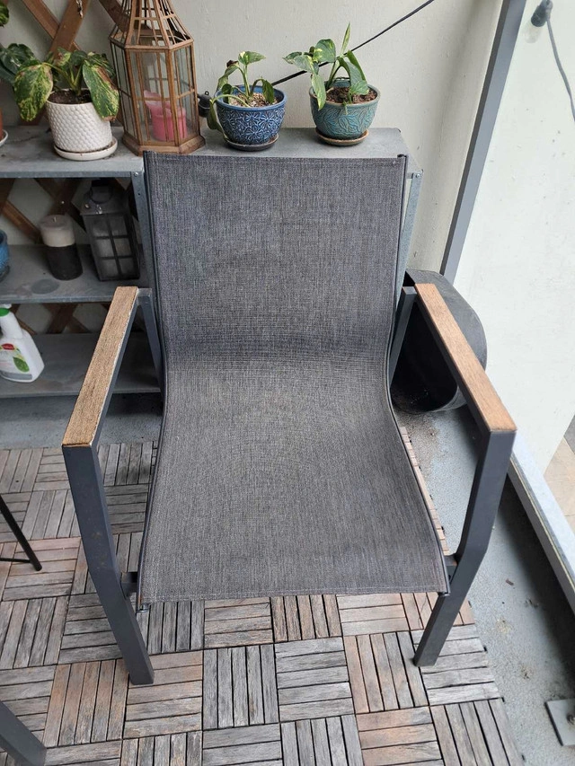 Create a cozy and stylish outdoor space with this 4 piece patio set. Perfect for a balcony or small deck, this set includes a loveseat, a chair, and a glass-topped coffee table. This is a used set and has some wear. Please see the photos for details.
