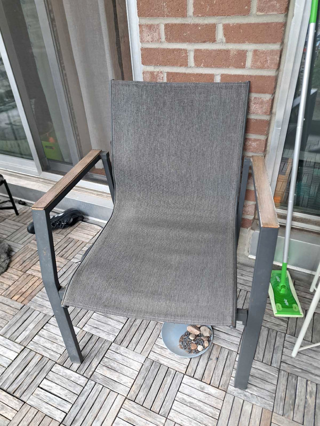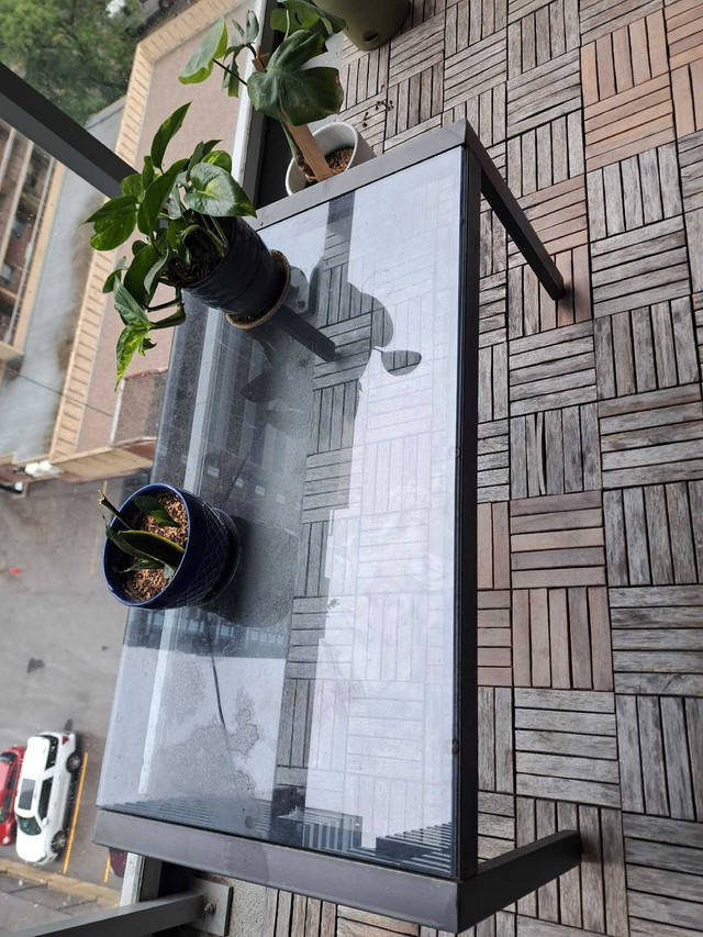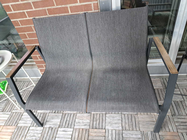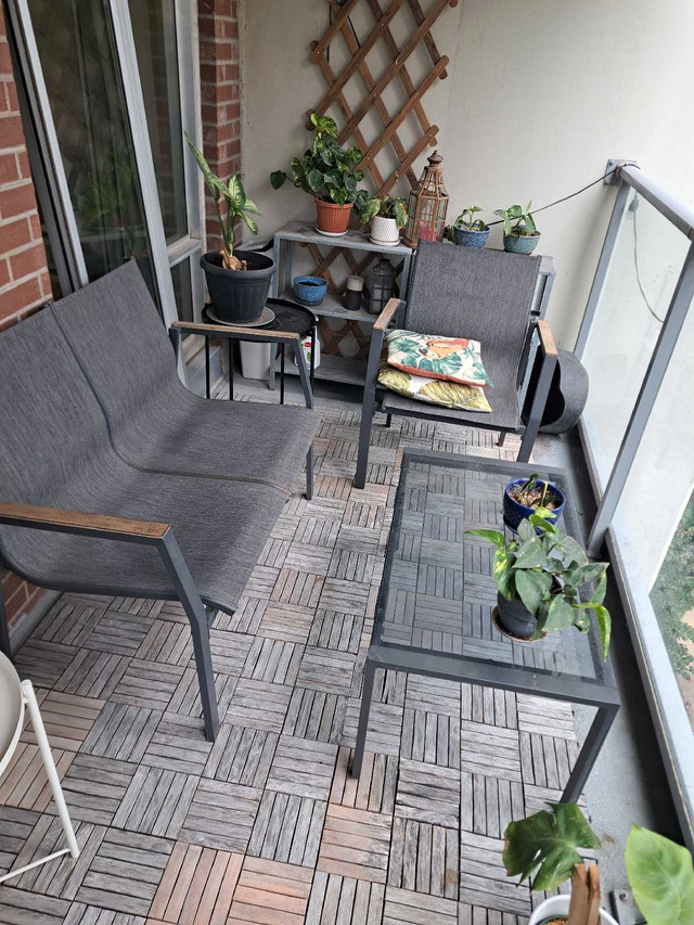 Create a cozy and stylish outdoor space with this 4 piece patio set. Perfect for a balcony or small deck, this set includes a loveseat, a chair, and a glass-topped coffee table. This is a used set and has some wear. Please see the photos for details.
