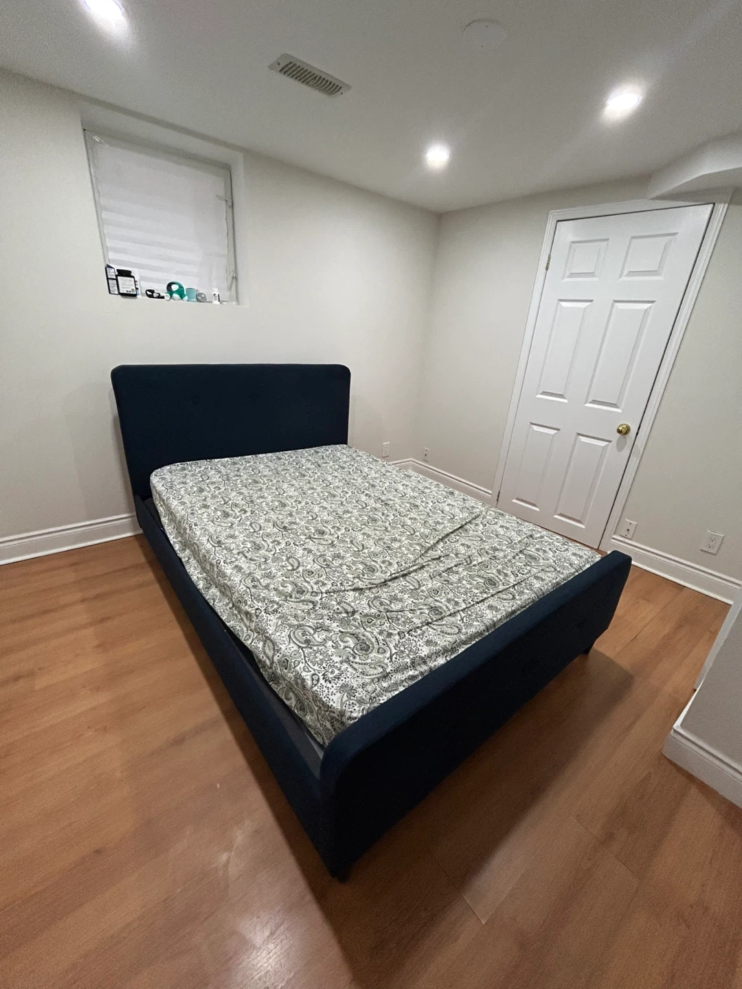 Used, but still in great condition. Mattress has some stains (can be deep cleaned, or you can take just the bed frame + headboard).