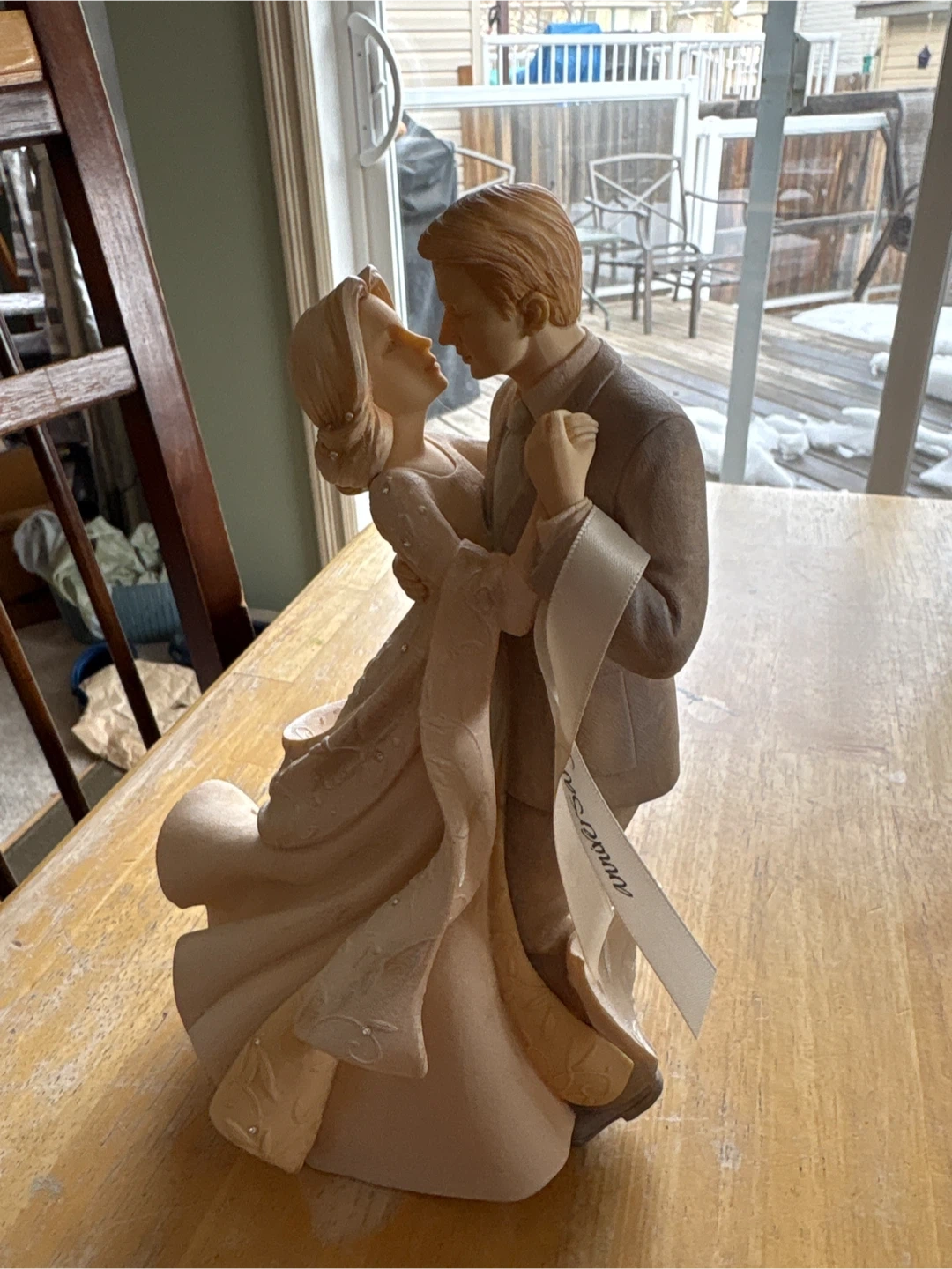 This is a lovely figurine featuring a couple dancing on their anniversary. It's made of resin and has soft pink and grey tones. The groom is dressed in a suit, and the woman’s dress is detailed with faint floral patterns and small rhinestones.