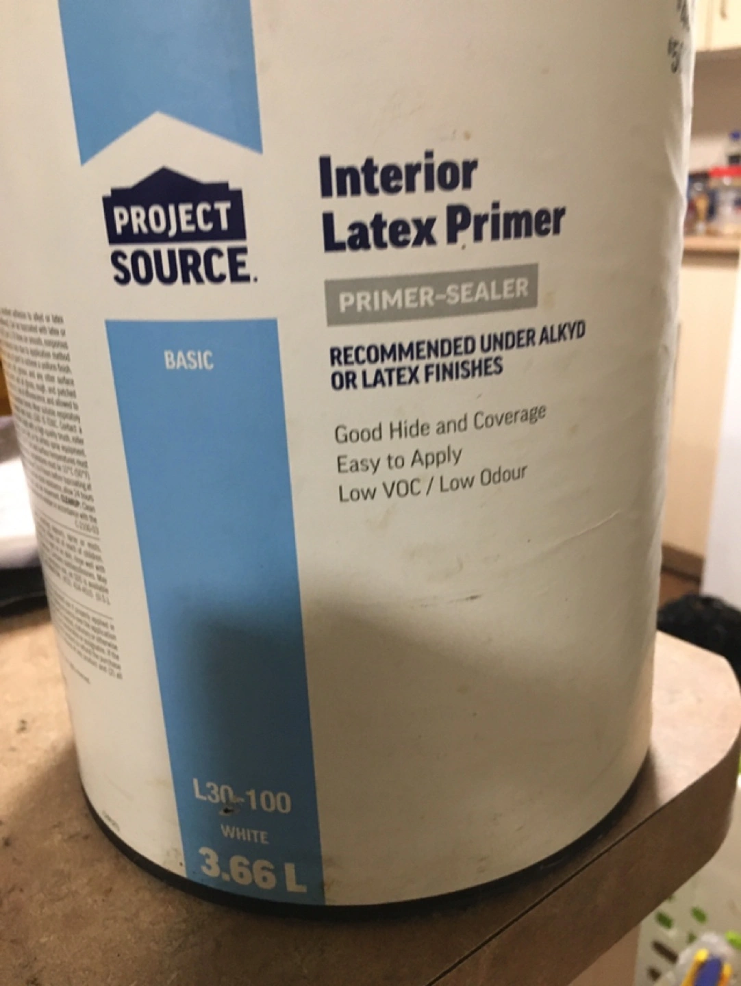 Selling a partially used can of Project Source Interior Latex Primer. It's a primer-sealer recommended under alkyd or latex finishes. It offers good hide and coverage, is easy to apply, and has a low VOC/low odour. The can contains 3.66L of white primer.