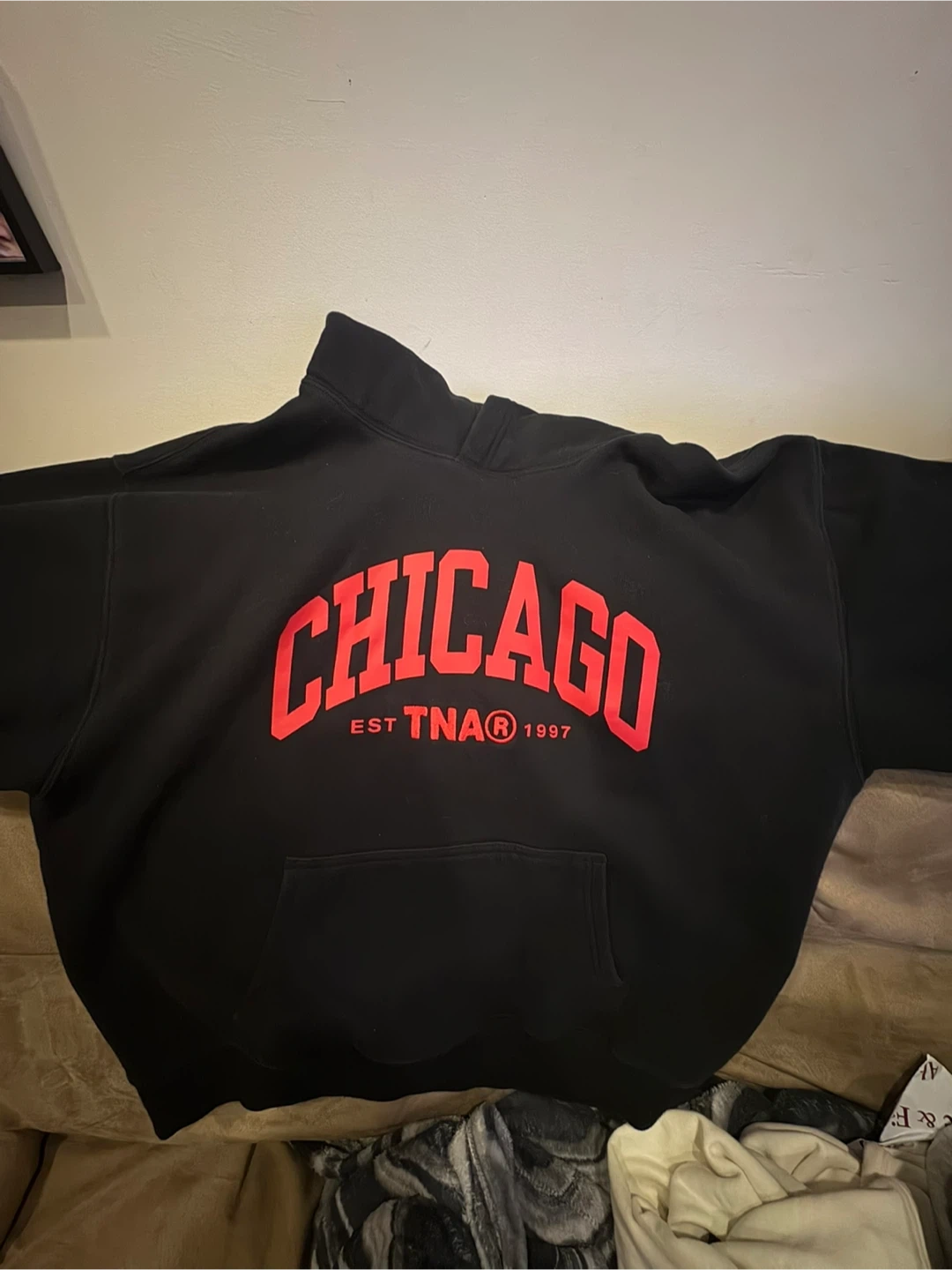 Black hoodie with red 'CHICAGO EST TNA 1997' graphic. It's a pullover style with a front kangaroo pocket. Made from a soft fabric blend, it offers a comfortable fit. Great for casual wear!