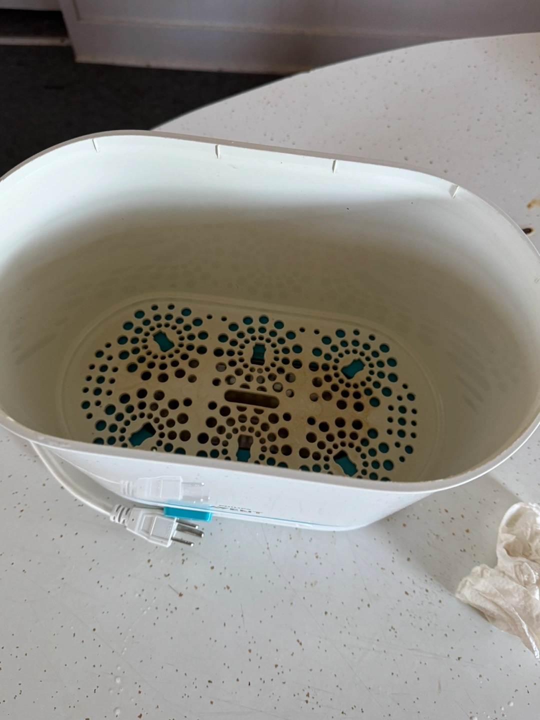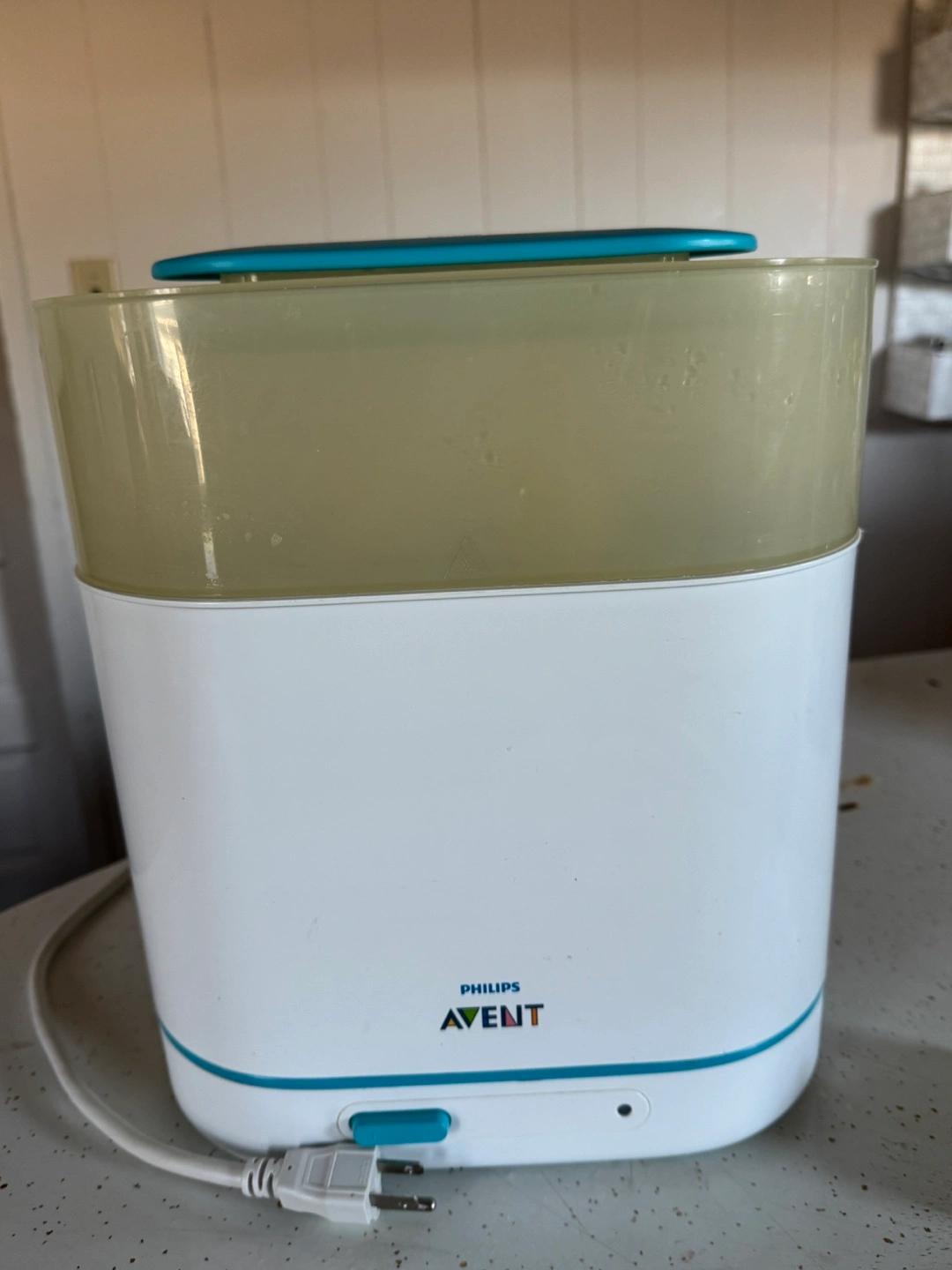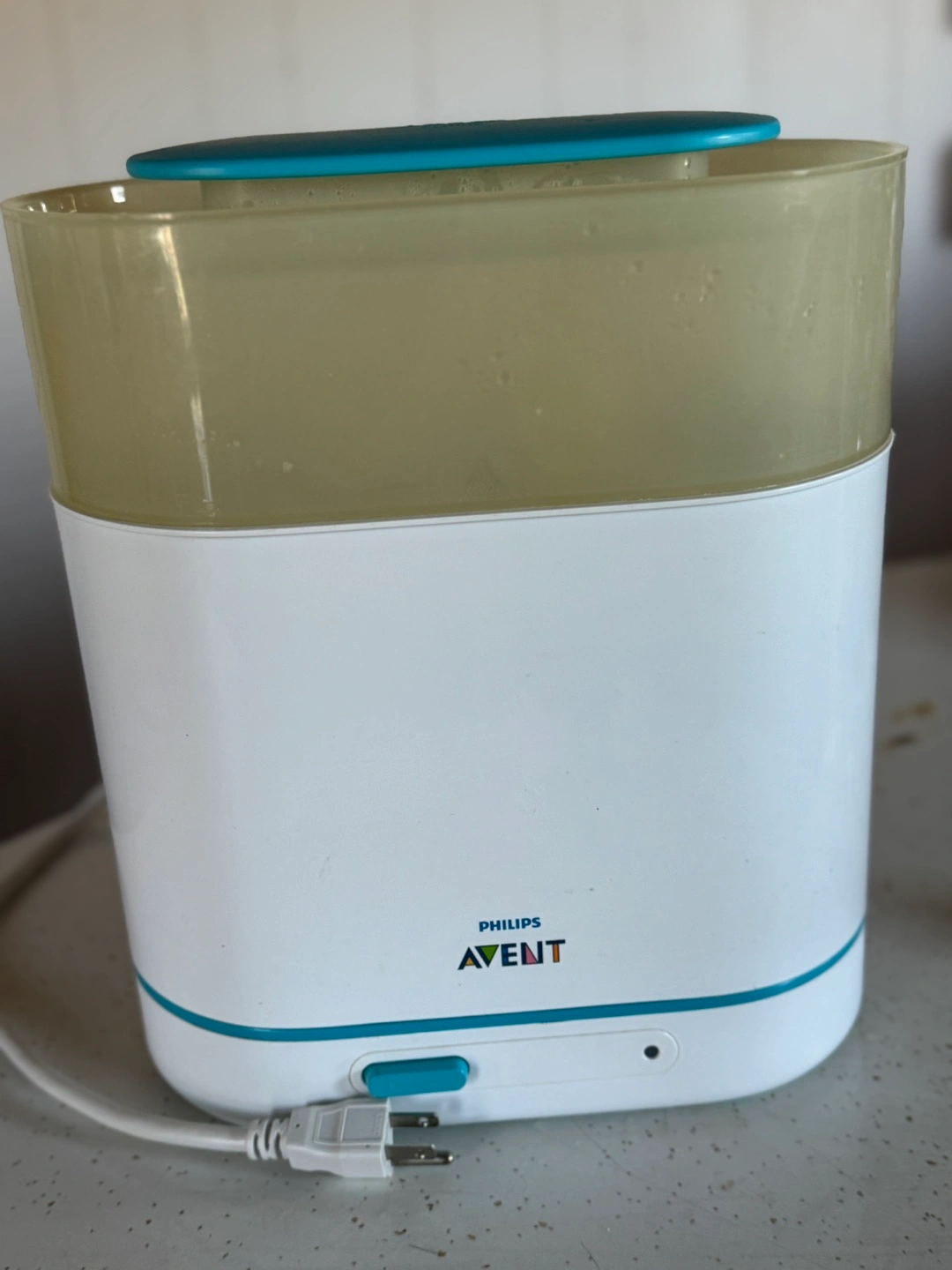 Electric baby bottle sterilizer. White and teal colour scheme. Includes removable tray. Used condition.