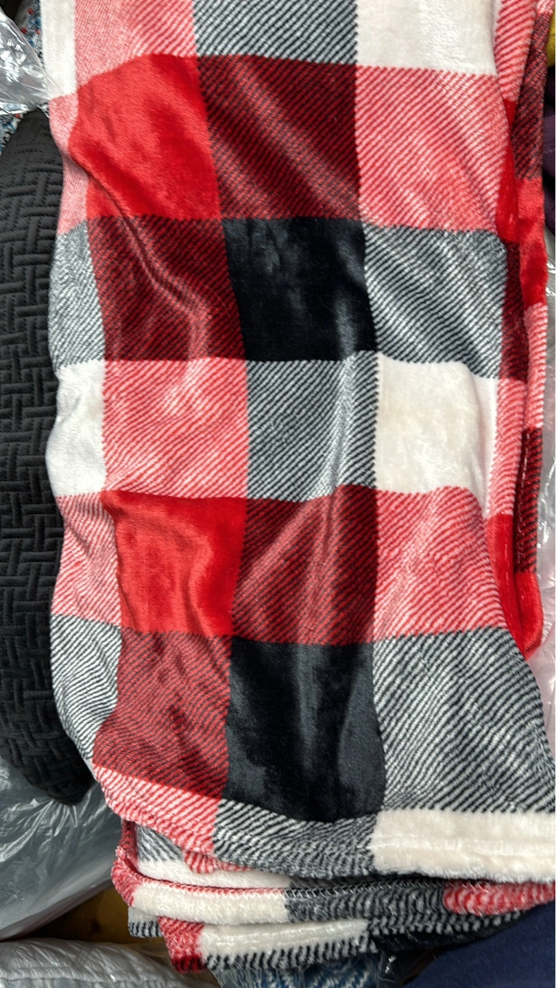 Soft plush throw blanket. Features a classic buffalo check pattern in shades of red, black, and white. Perfect for snuggling up on the couch.