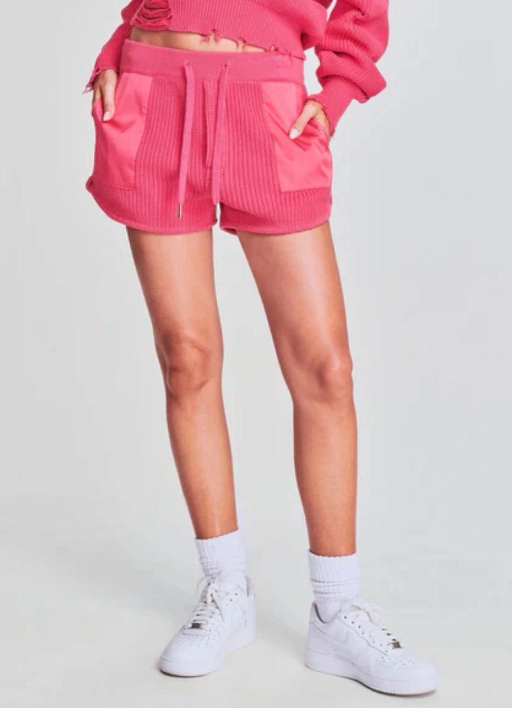 Women's pink knit shorts. Features ribbed knit fabric, satin side pockets, and drawstring waist. New with tag, Retail is $230, sold out style. Pick up only.