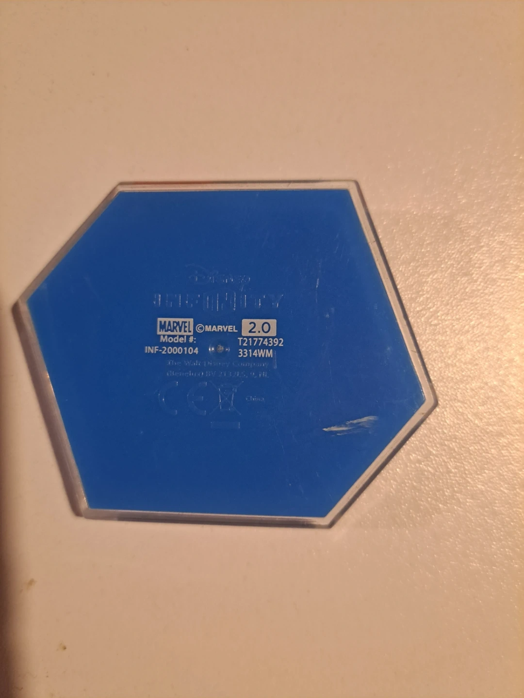 This is a Disney Infinity 2.0 Marvel figure base. It's compatible with Marvel characters and playsets. The base is blue with a hexagonal shape.