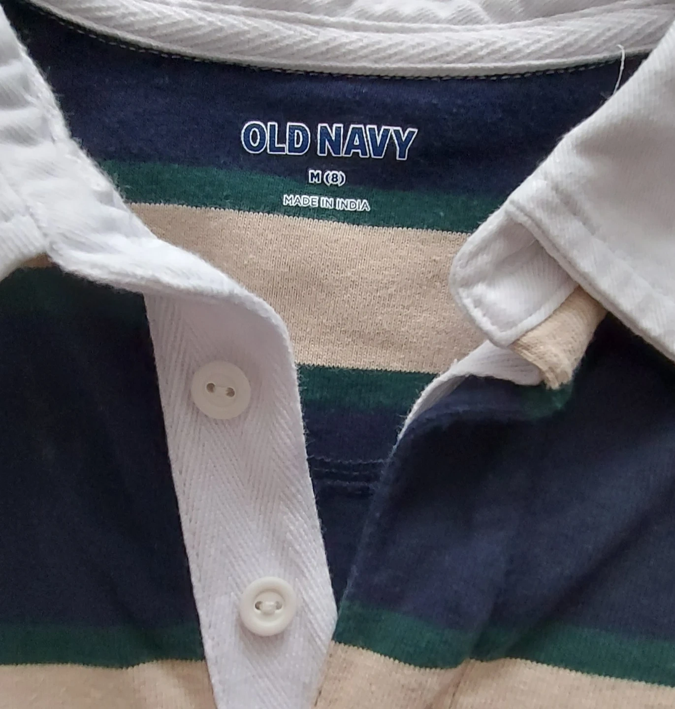 Old Navy long-sleeve rugby shirt with a classic collar and button placket. Features navy, beige, and green stripes. Made in India. Size medium, 8yr.
