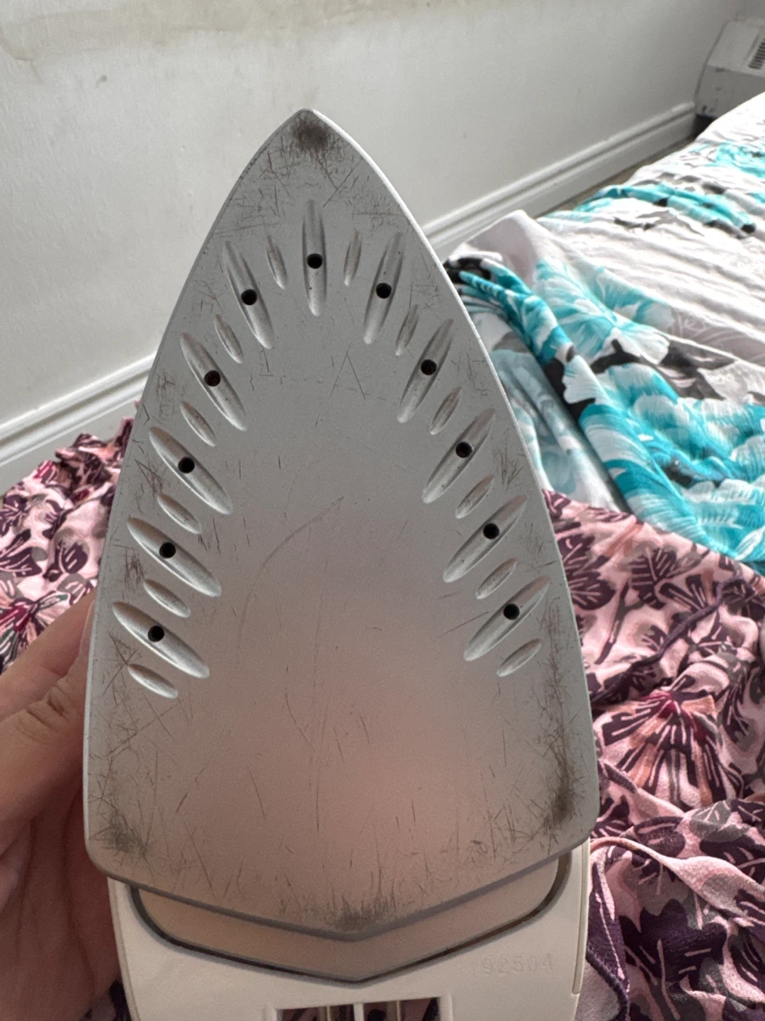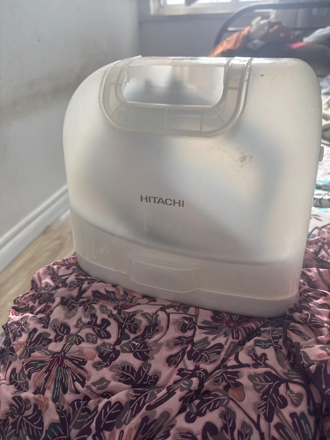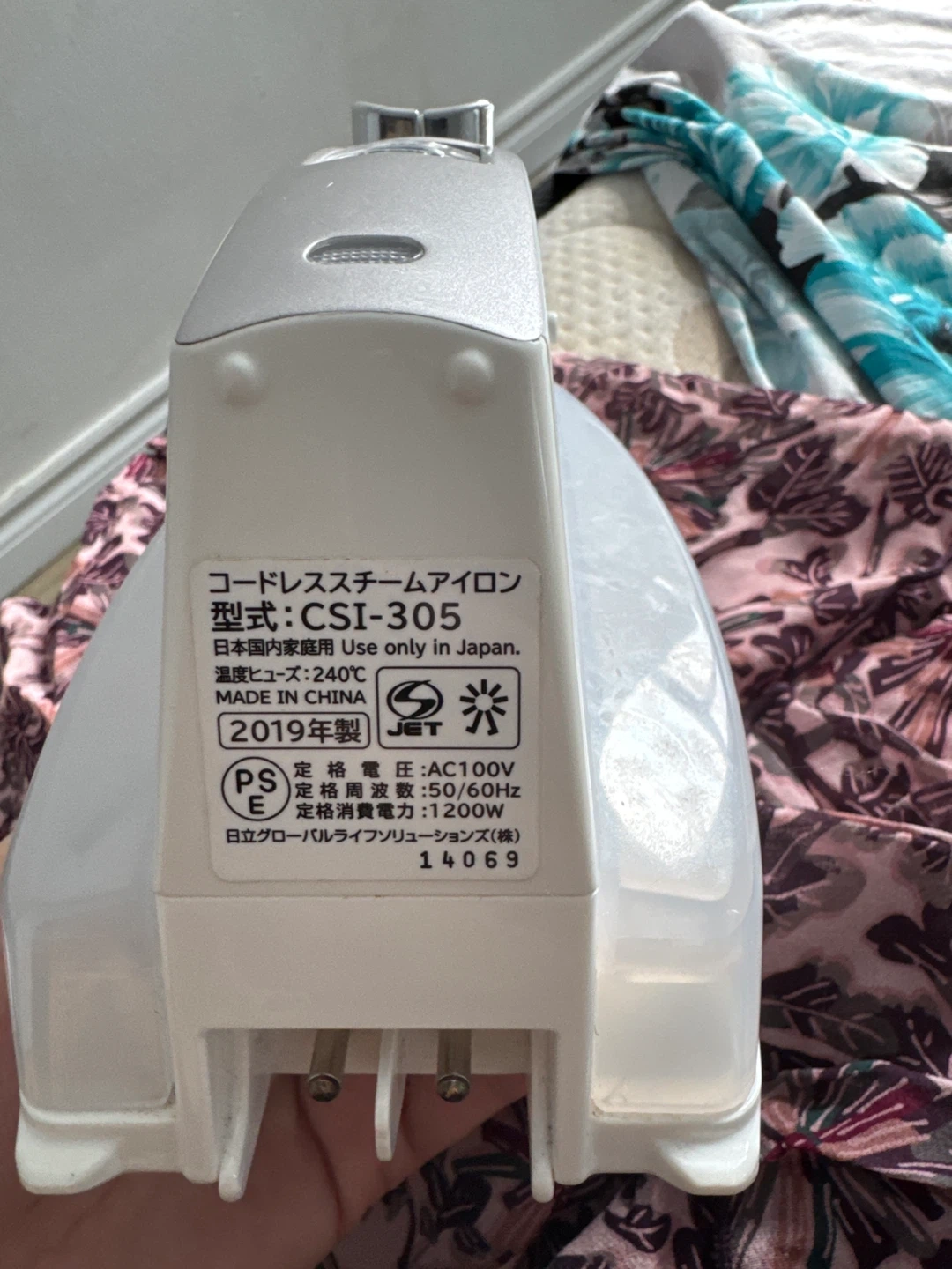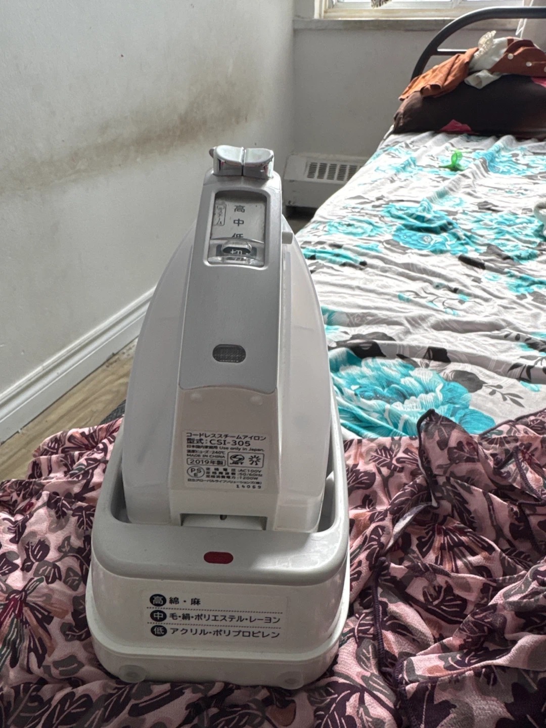 This is a Hitachi CSI-305 cordless steam iron. It has a ceramic soleplate for smooth gliding. The iron has three temperature settings: high, medium, and low. It's great for keeping clothes looking sharp!