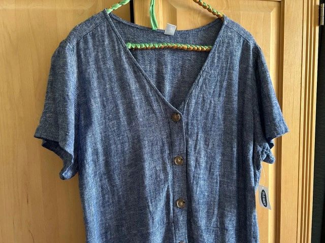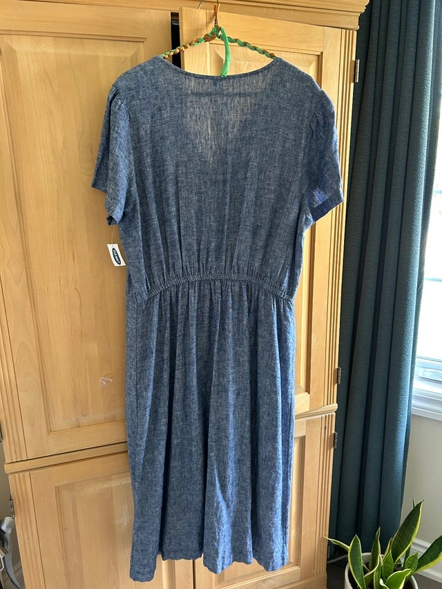 Store tags still attached. This 55% linen dress looks like denim. It's comfy with elastic at the back of the waist. Features buttons down the front and short sleeves. Pickup in Brampton, near Queen and Kennedy.