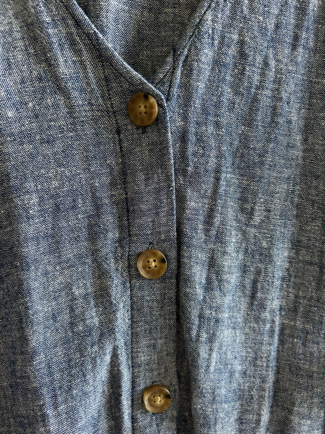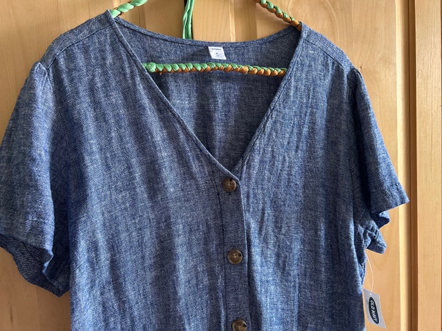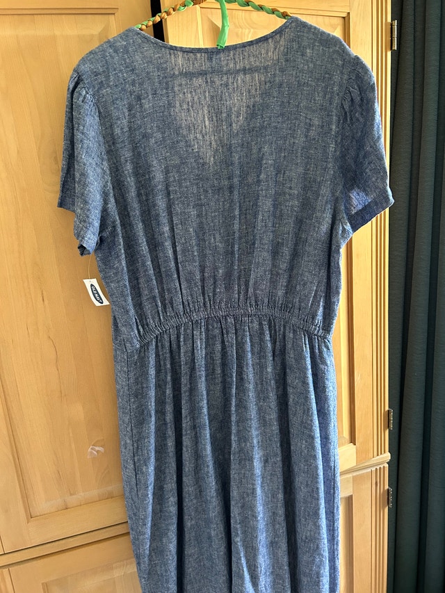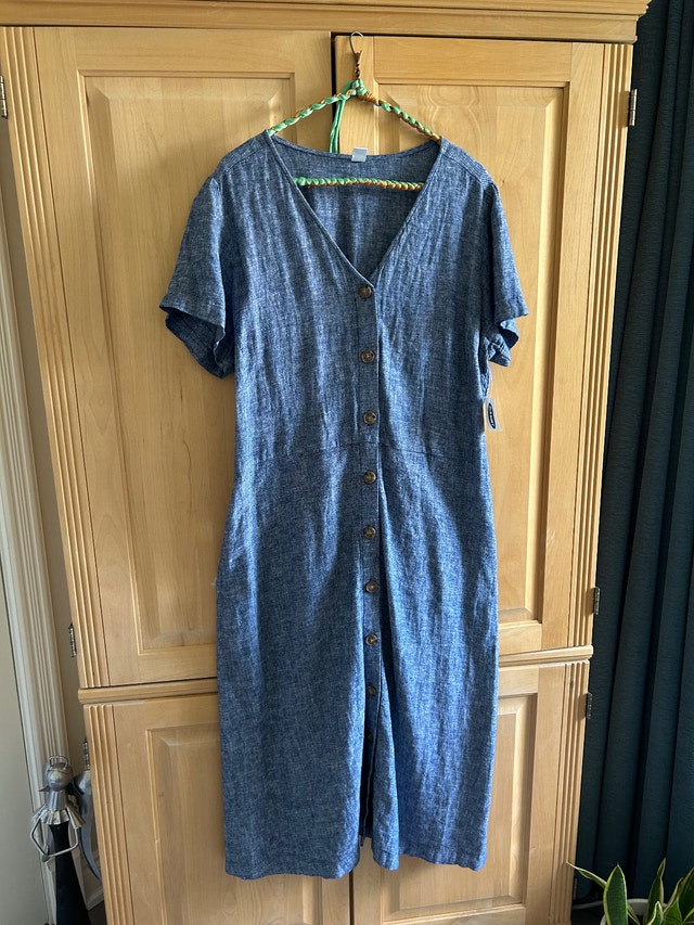 Store tags still attached. This 55% linen dress looks like denim. It's comfy with elastic at the back of the waist. Features buttons down the front and short sleeves. Pickup in Brampton, near Queen and Kennedy.