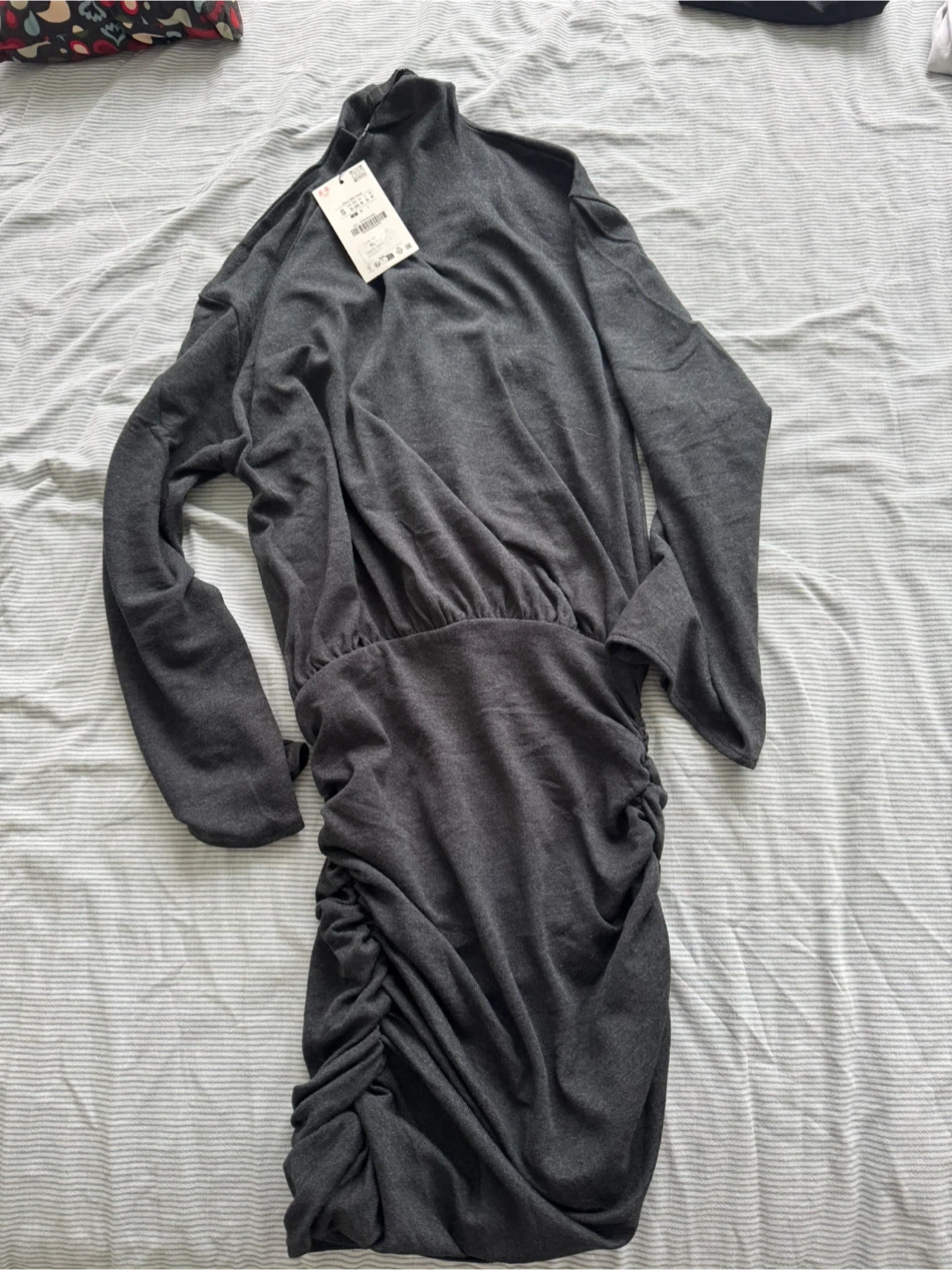 This is a Zara women's long sleeve mock neck dress in a charcoal grey colour. It features ruching detail on the side and a shirred waist. Made in Turkey. Size is Small.