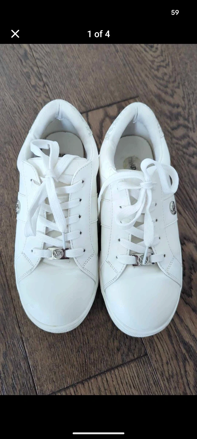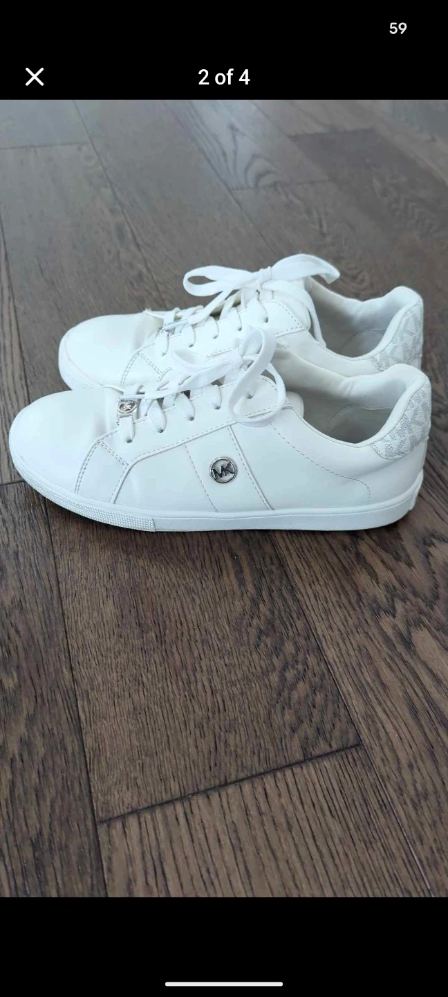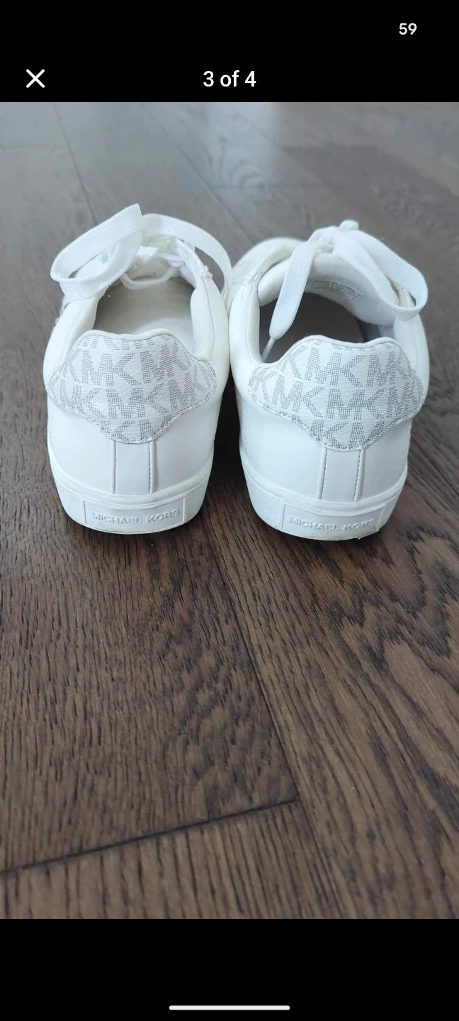 White Michael Kors low-top sneakers with lace-up closure. Features the MK logo pattern on the heel.