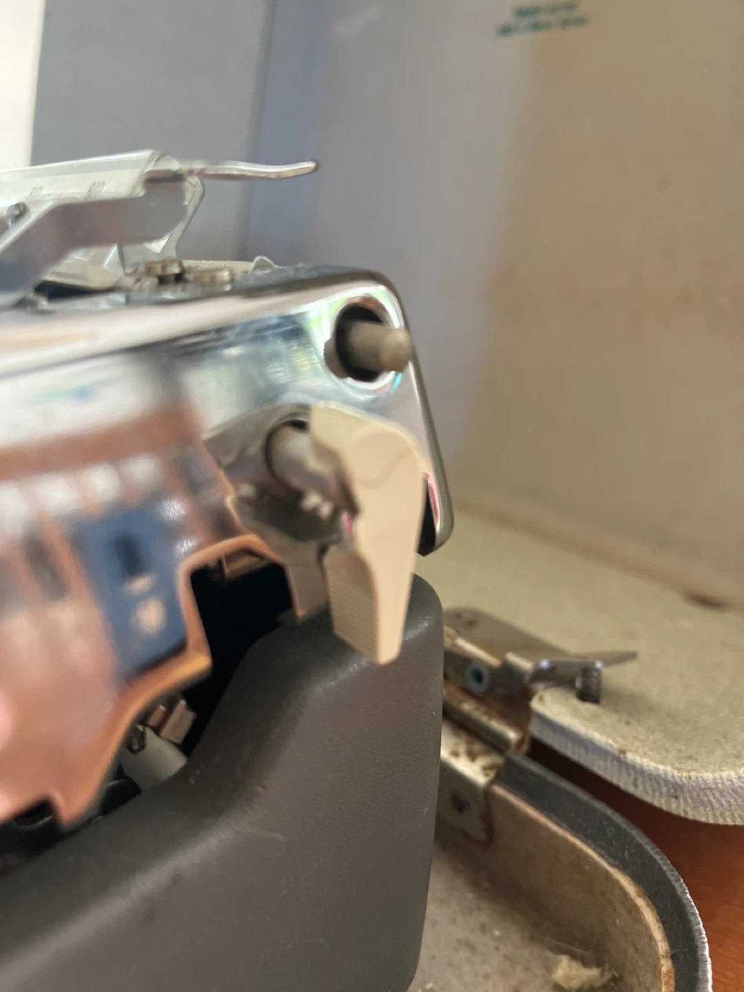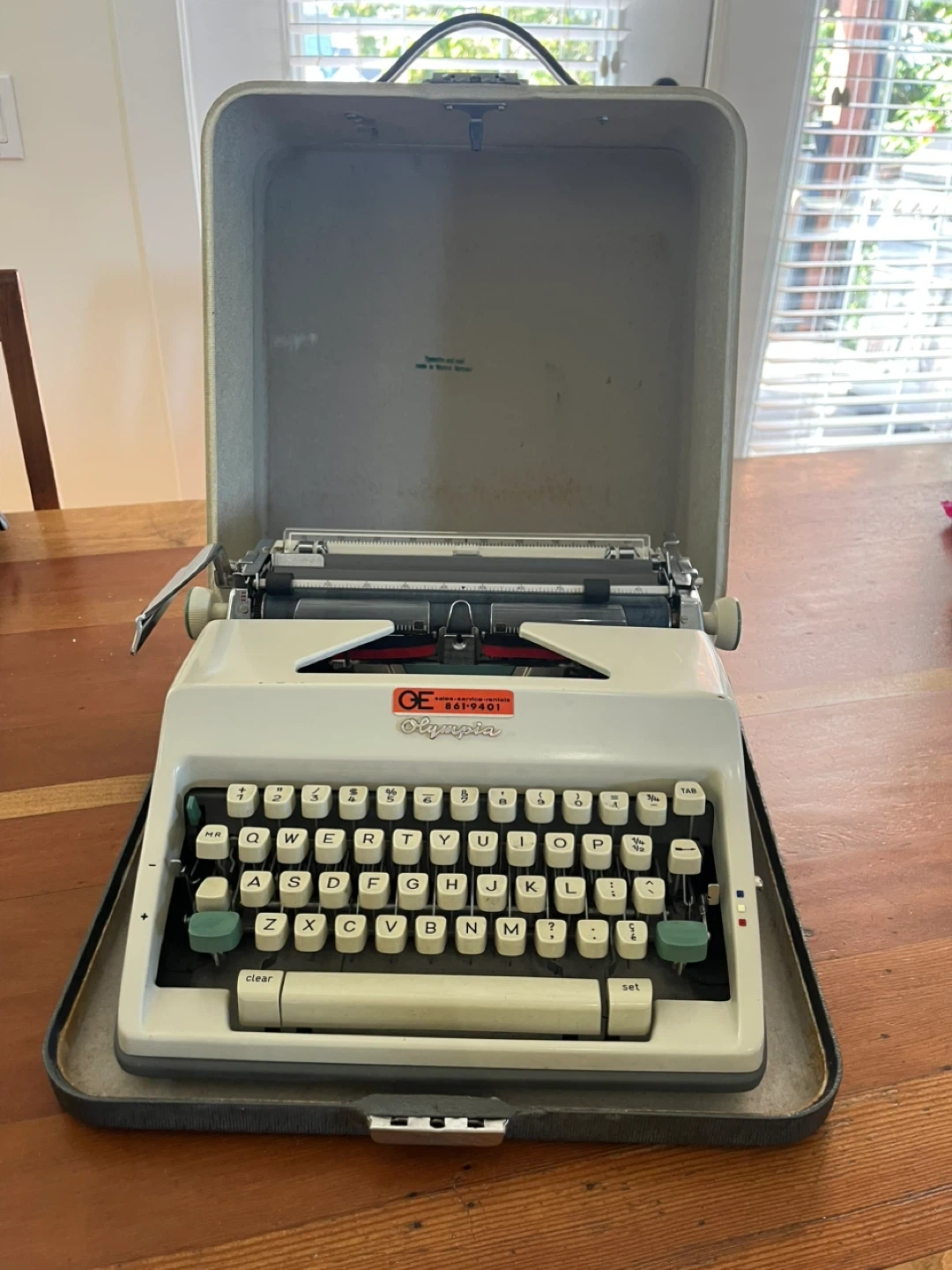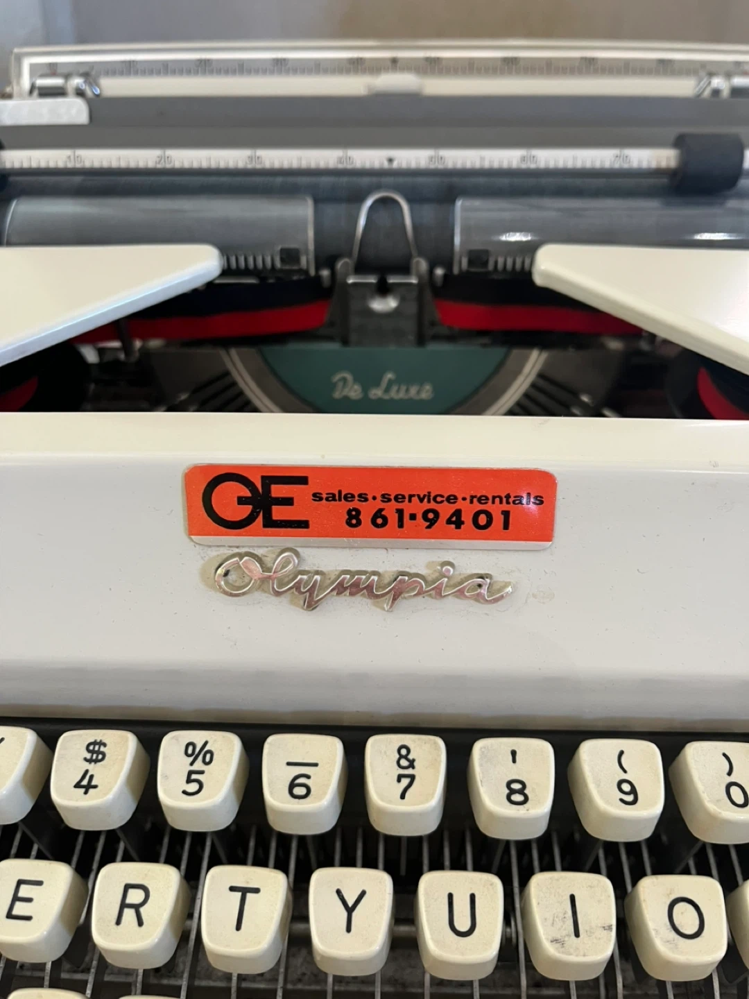Working vintage Olympia DeLuxe typewriter in a portable case. This mechanical typewriter was made in Western Germany in the 1960’s and includes the original carrying case. It works—there is one broken plastic knob cover (see last photo) but it doesn’t impact functionality. Perfect for collectors and writers seeking a tactile, analog experience.