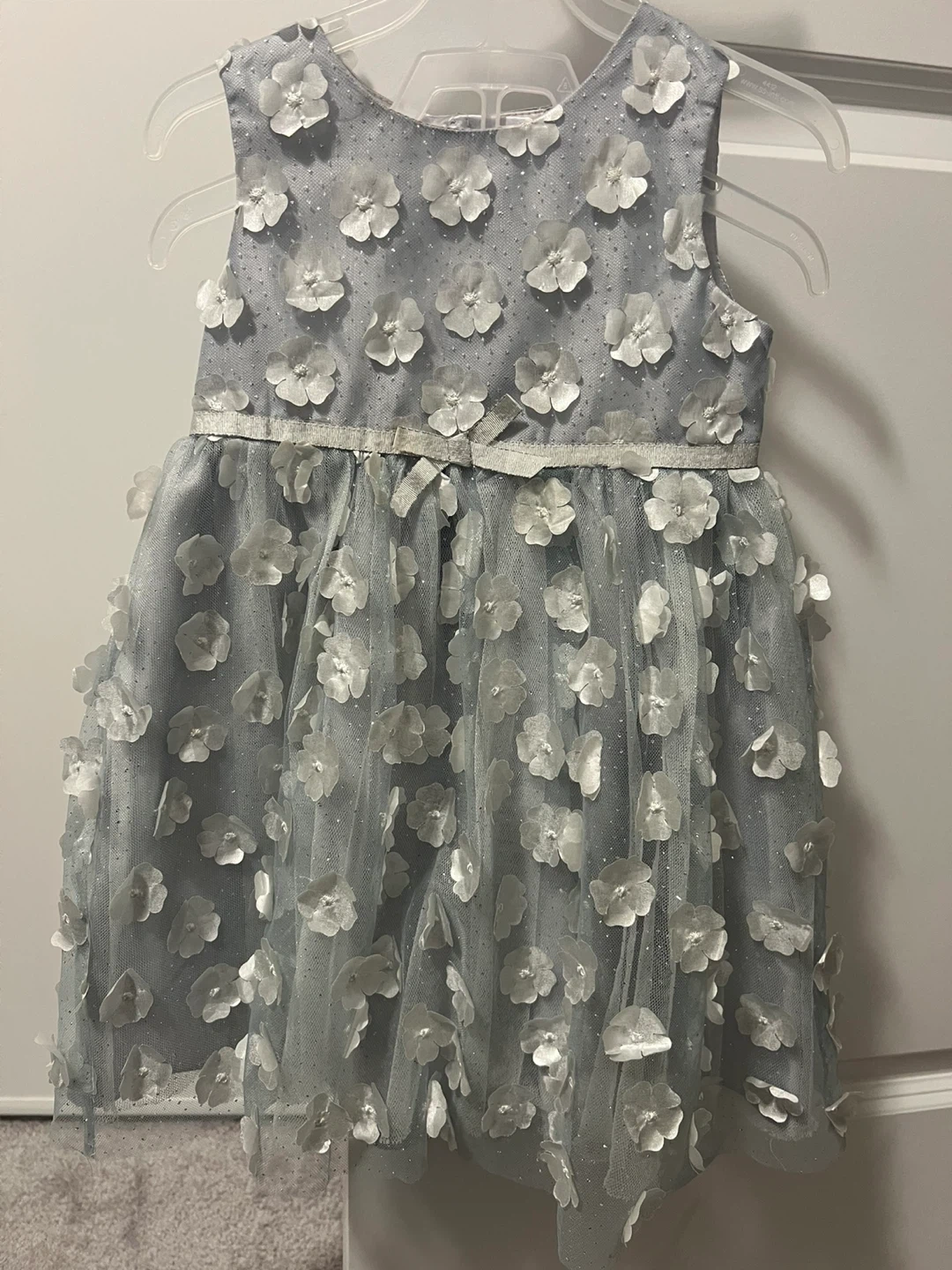 This adorable sleeveless dress features a sparkly grey overlay with scattered 3D white flowers. It has a ribbon waist detail and a full, tiered skirt for a festive look. Perfect for special occasions! this is for 12-18 months.