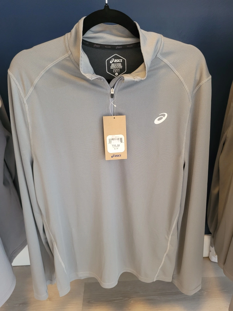 This is an new Asics grey 1/4 zip pullover in size Small. The tag shows it originally retails for $110 + tax. It's new and ready for your next workout or golf...