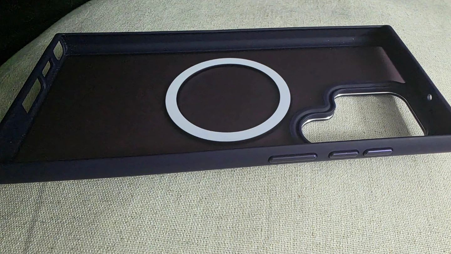 OtterBox Symmetry Series case for Samsung Galaxy S22 Ultra. Features MagSafe compatibility and a deep purple colour. It's a protective phone case.