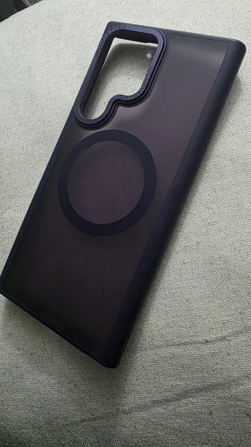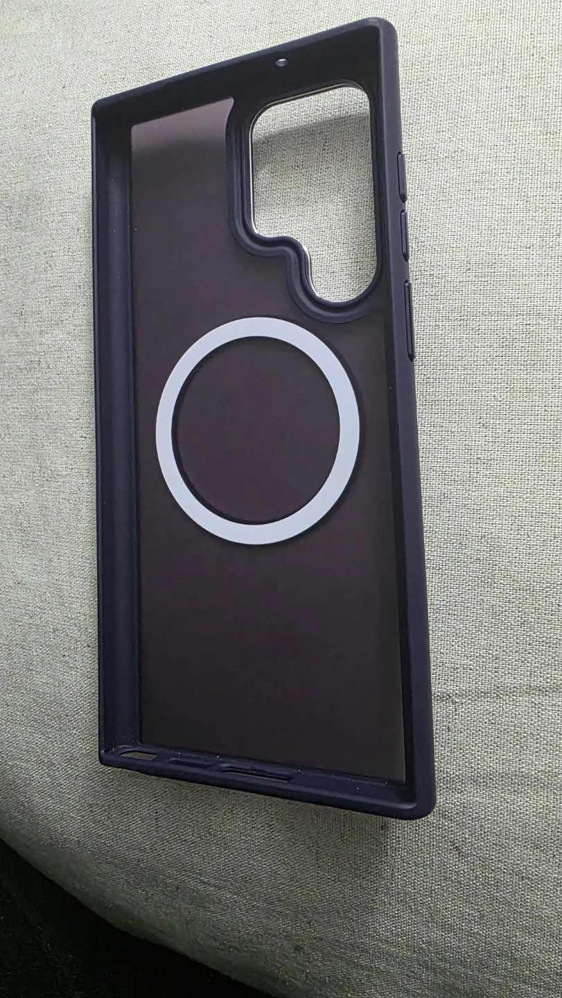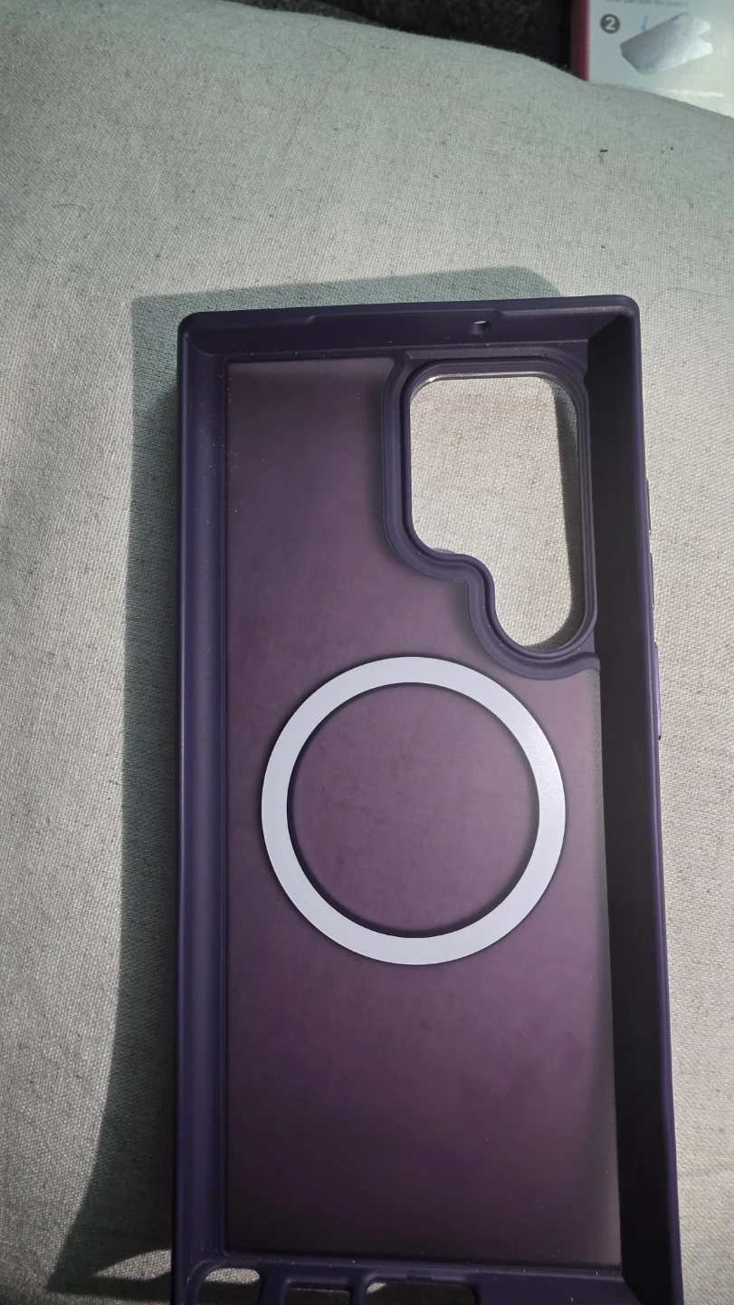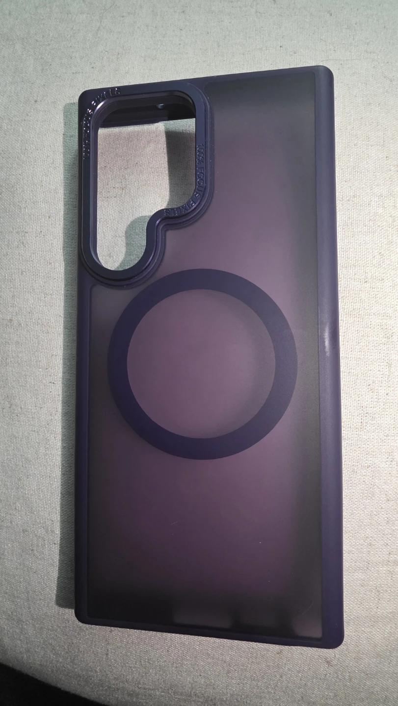 OtterBox Symmetry Series case for Samsung Galaxy S22 Ultra. Features MagSafe compatibility and a deep purple colour. It's a protective phone case.