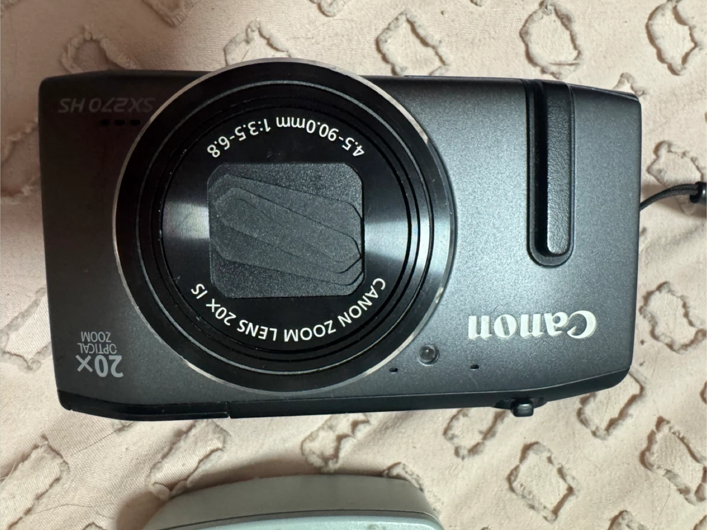 Canon PowerShot SX270 HS digital camera with 20x optical zoom. Includes Canon battery charger and battery. Camera has 12.1 megapixels.