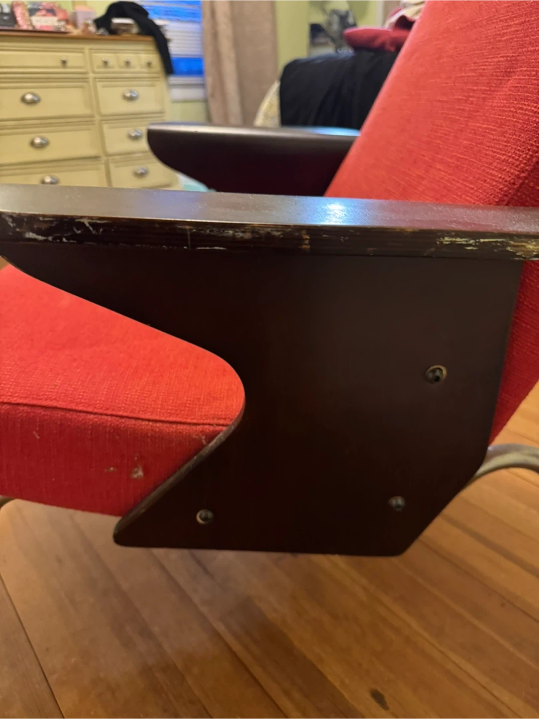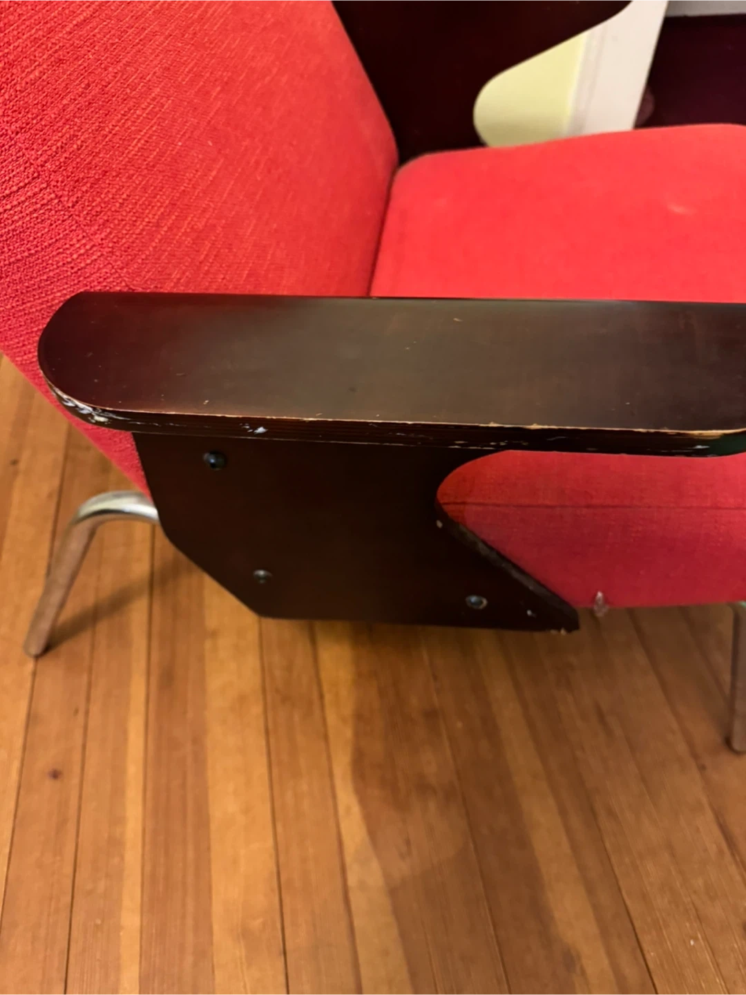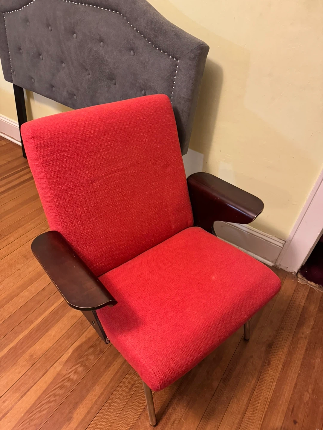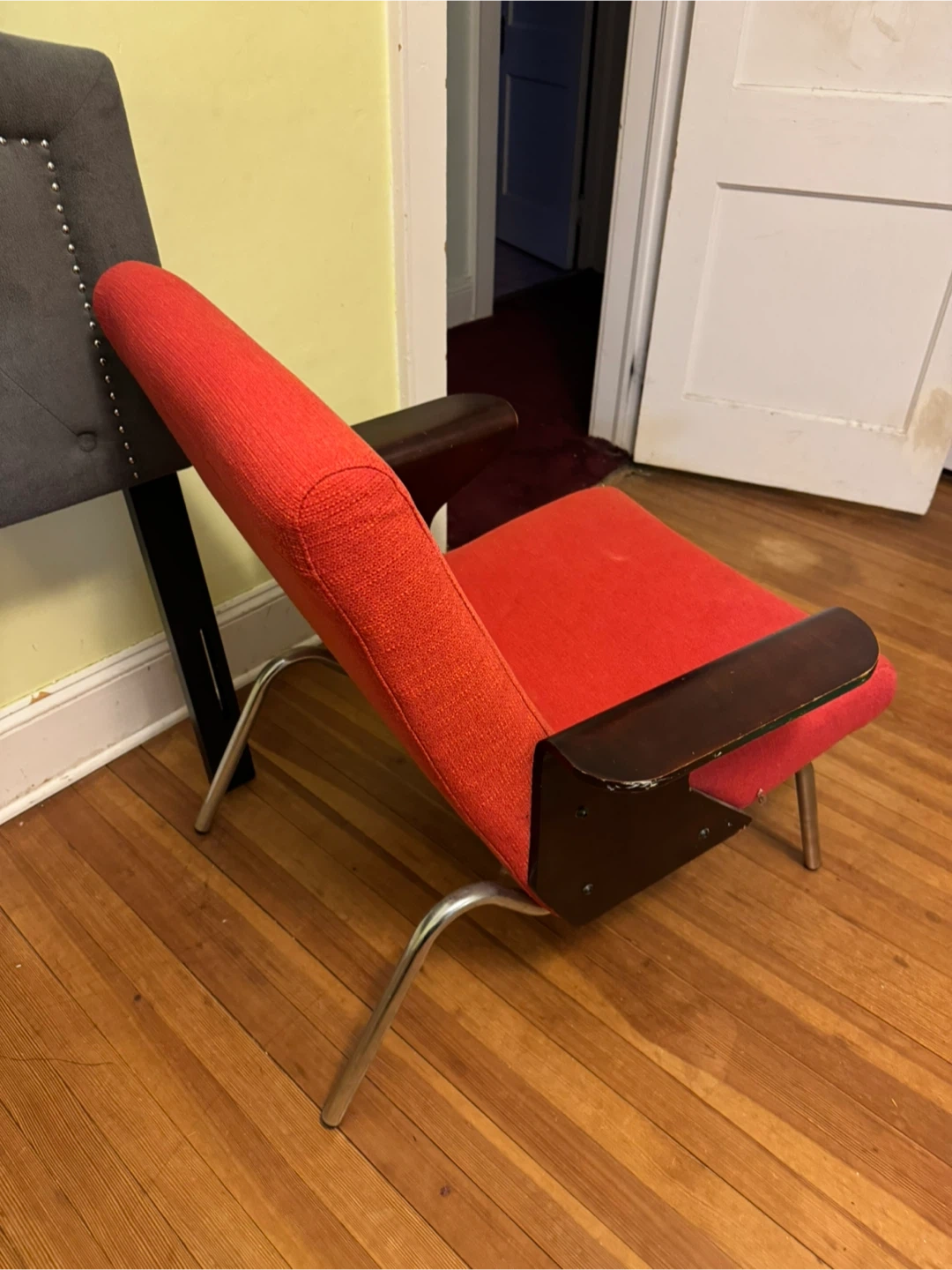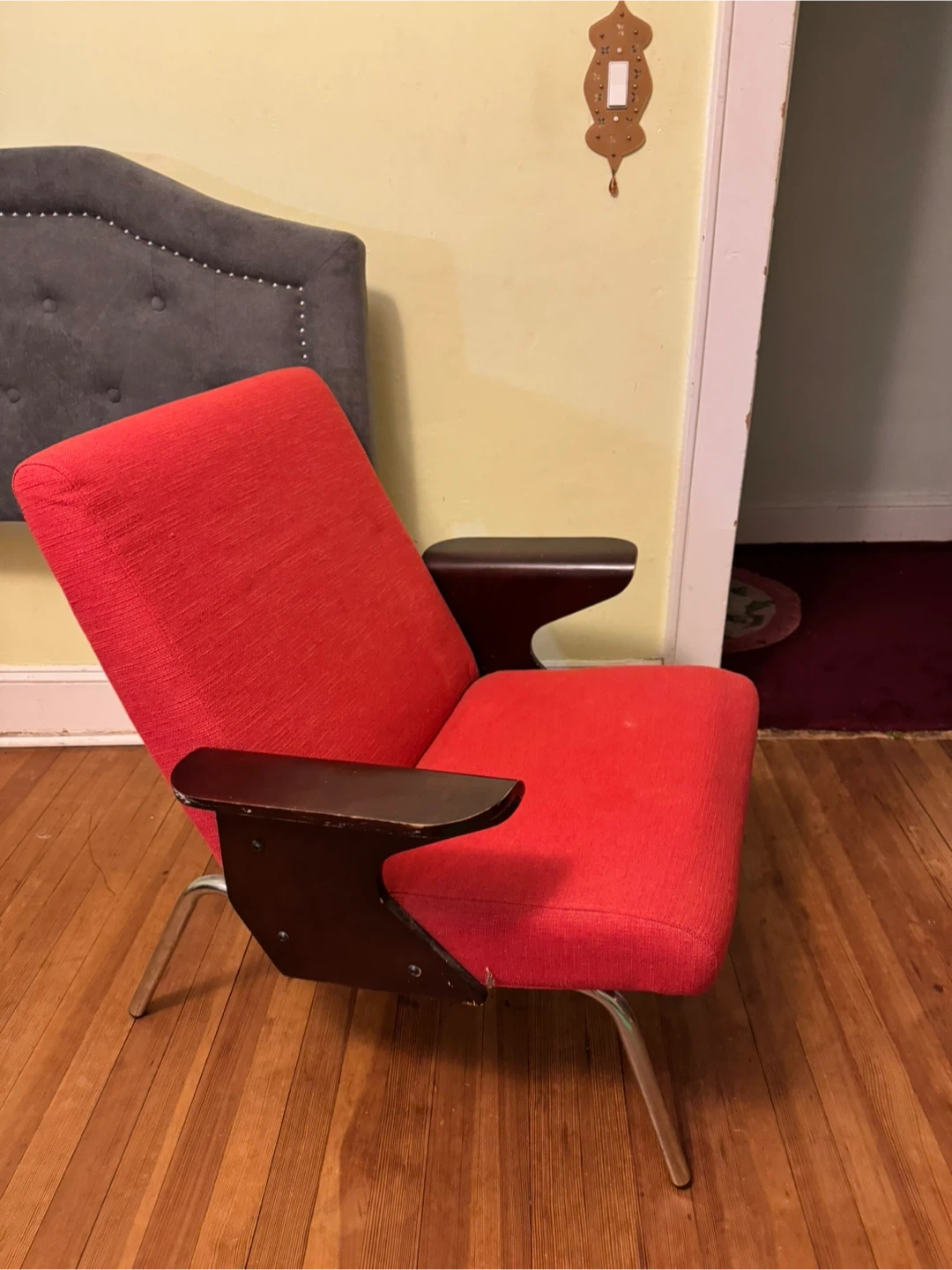 This is a vintage armchair with a neutral orange red fabric upholstered seat and back. It features dark wood armrests probably needs a little touching up, but the chair is adorable and it could be perfect than any eclectic artistic room or salon and has chrome metal legs. It's a stylish piece for any room! Price negotiable within reason.
