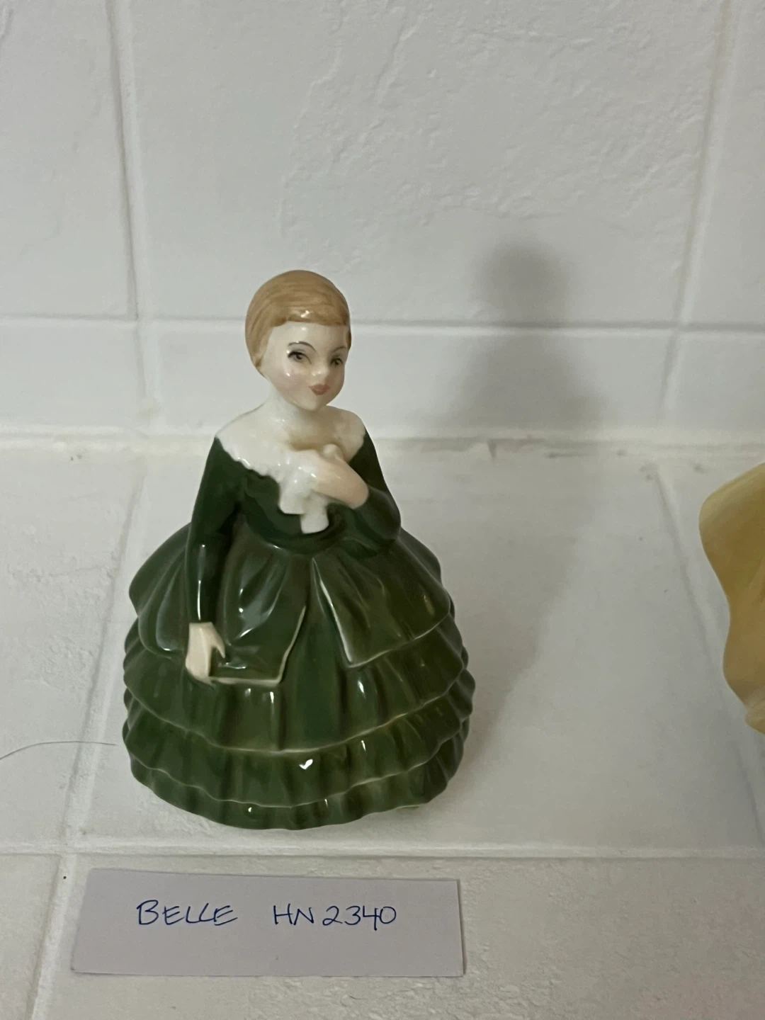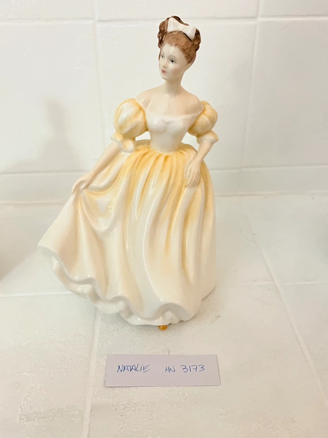 A collection of decorative porcelain figurines. Each piece depicts a lady in period dress, with unique names like Natalie, Adrienne, Alexandra, Coralie, and Belle. Various HN numbers are associated with these pieces.