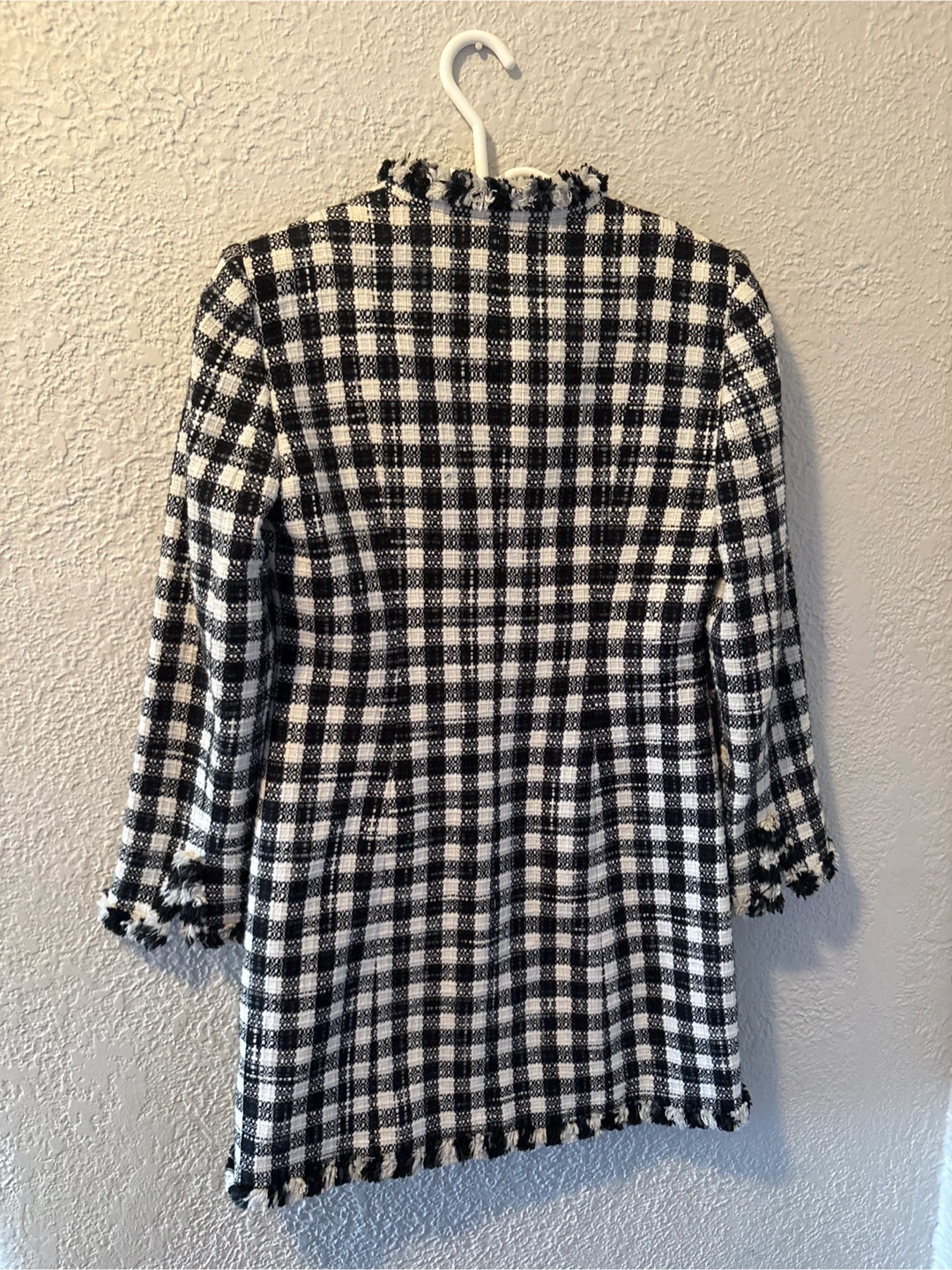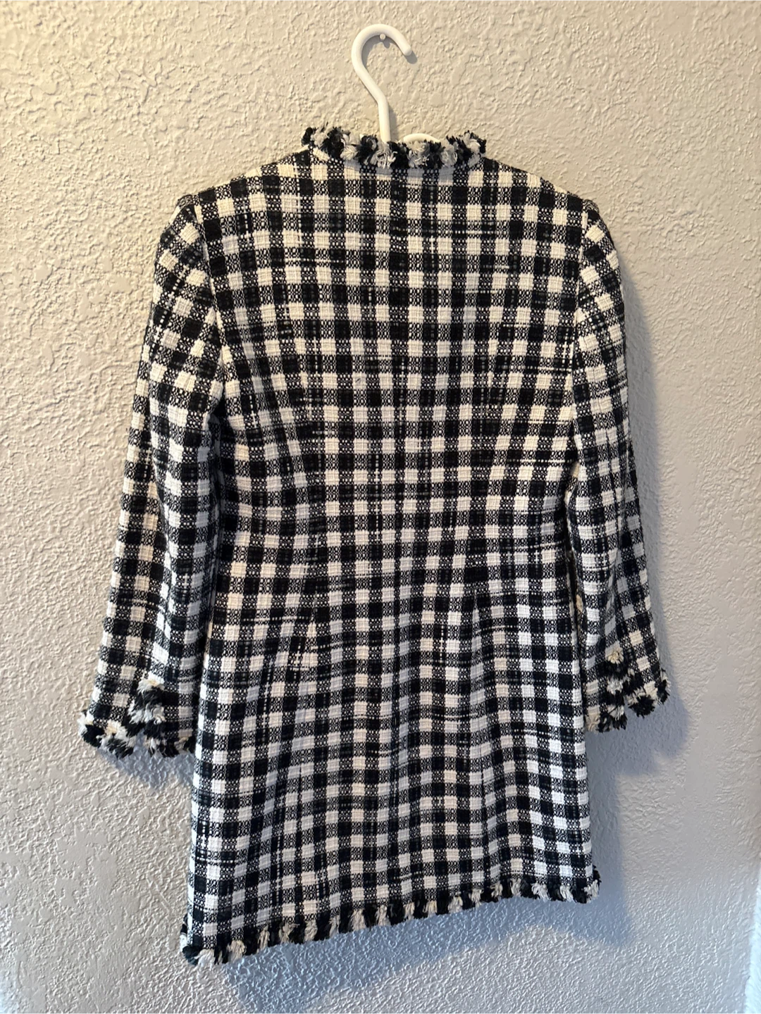Here's a Tahari Arthur S. Levine blazer in a black and white plaid pattern. It's a petite size 4P. The blazer has a unique frayed trim and a classic look!