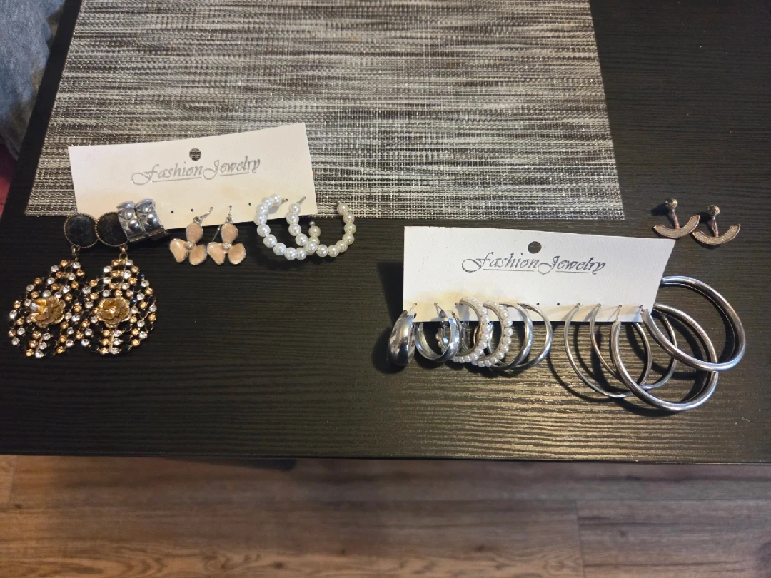 A lovely set of fashion earrings! Includes a variety of styles, from sparkly gold and silver to classic hoops and pearl accents. Perfect for adding a touch of glam to any outfit