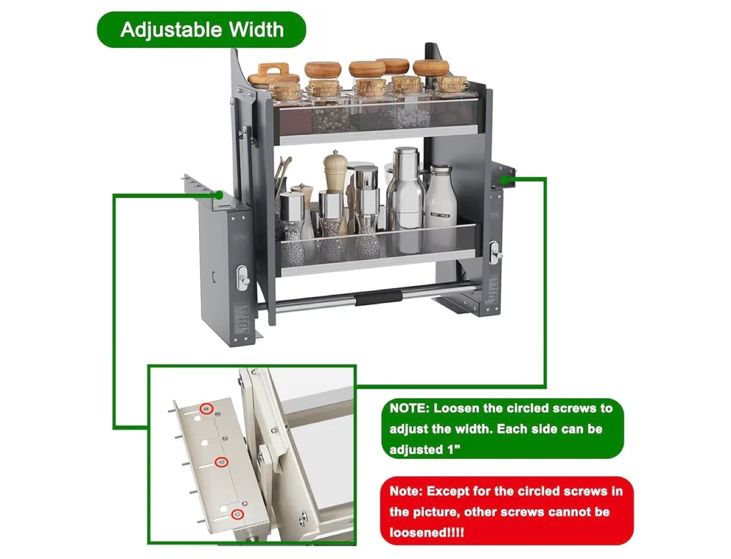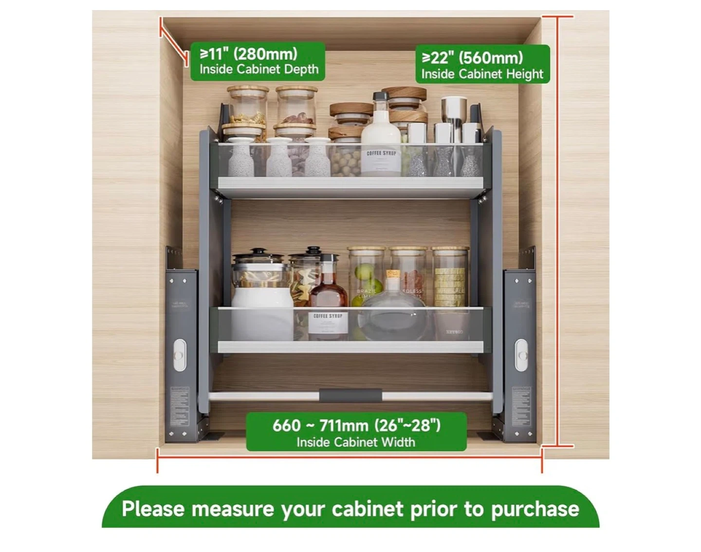Two-tier pull-down cabinet organizer rack. Features adjustable width from 26" to 28". Metal construction. Mounts inside kitchen cabinets.