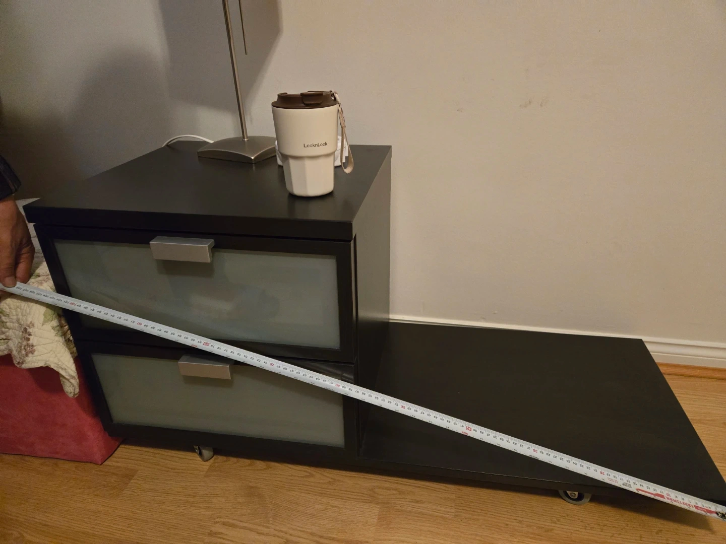 Black bedside table featuring two frosted glass drawers with silver handles. It's on wheels for easy movement. Includes a LocknLock tumbler on top.