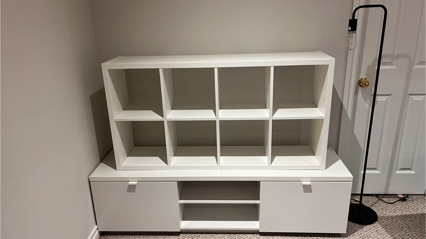 Ikea tv bench, book shelve, floor lamp