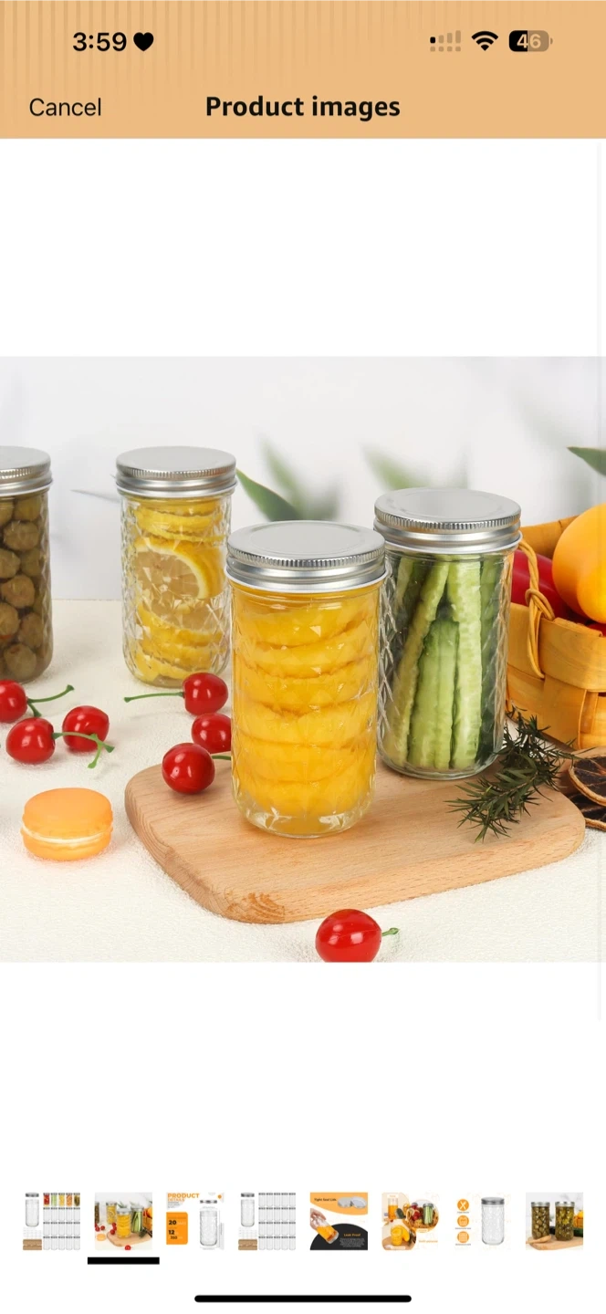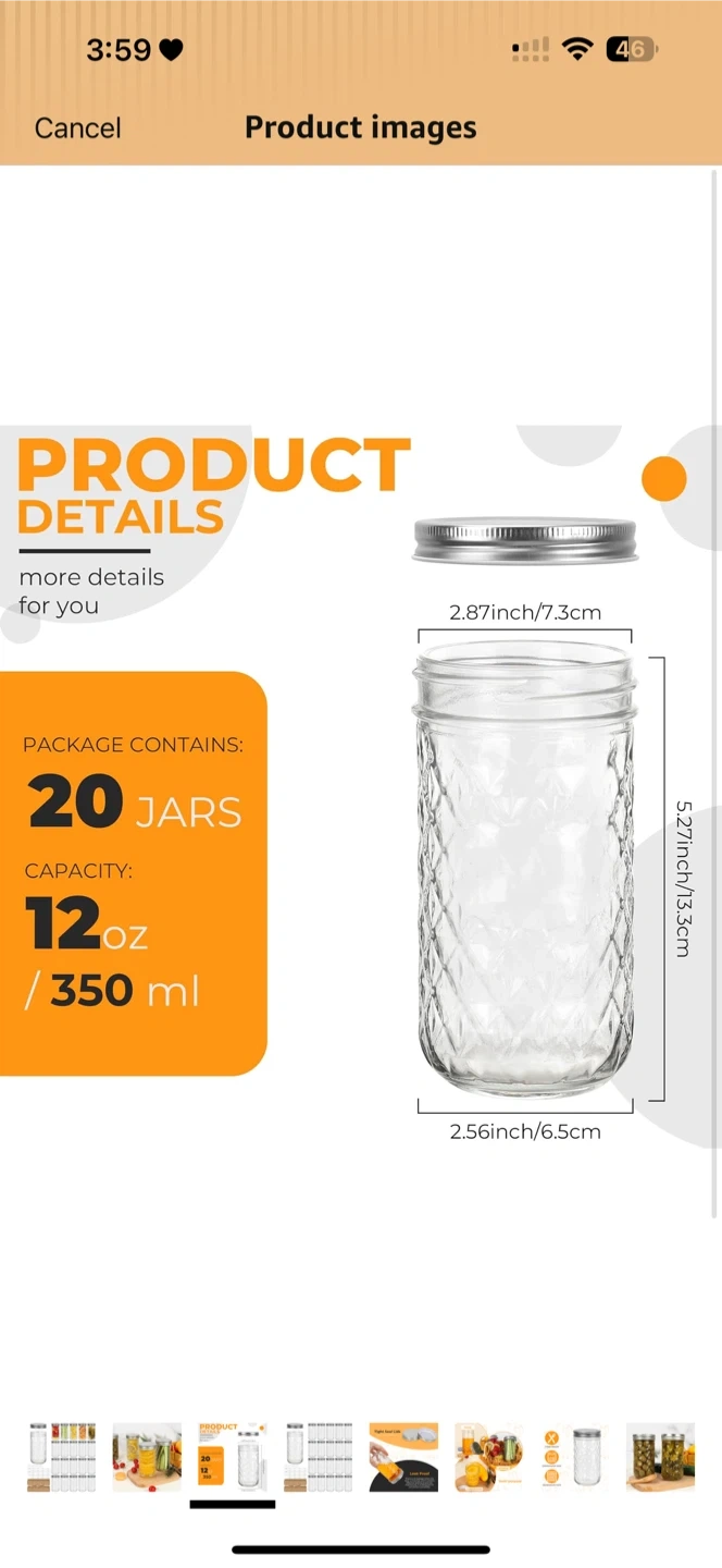 D This is a 20-pack of Eathtek 12 oz mason jars, each with a 350 ml capacity. The jars are made of clear glass with diamond-patterned texture and come with silver metal lids. They're suitable for canning, jelly, herbs, spice storage, and candle making. Dishwasher safe.