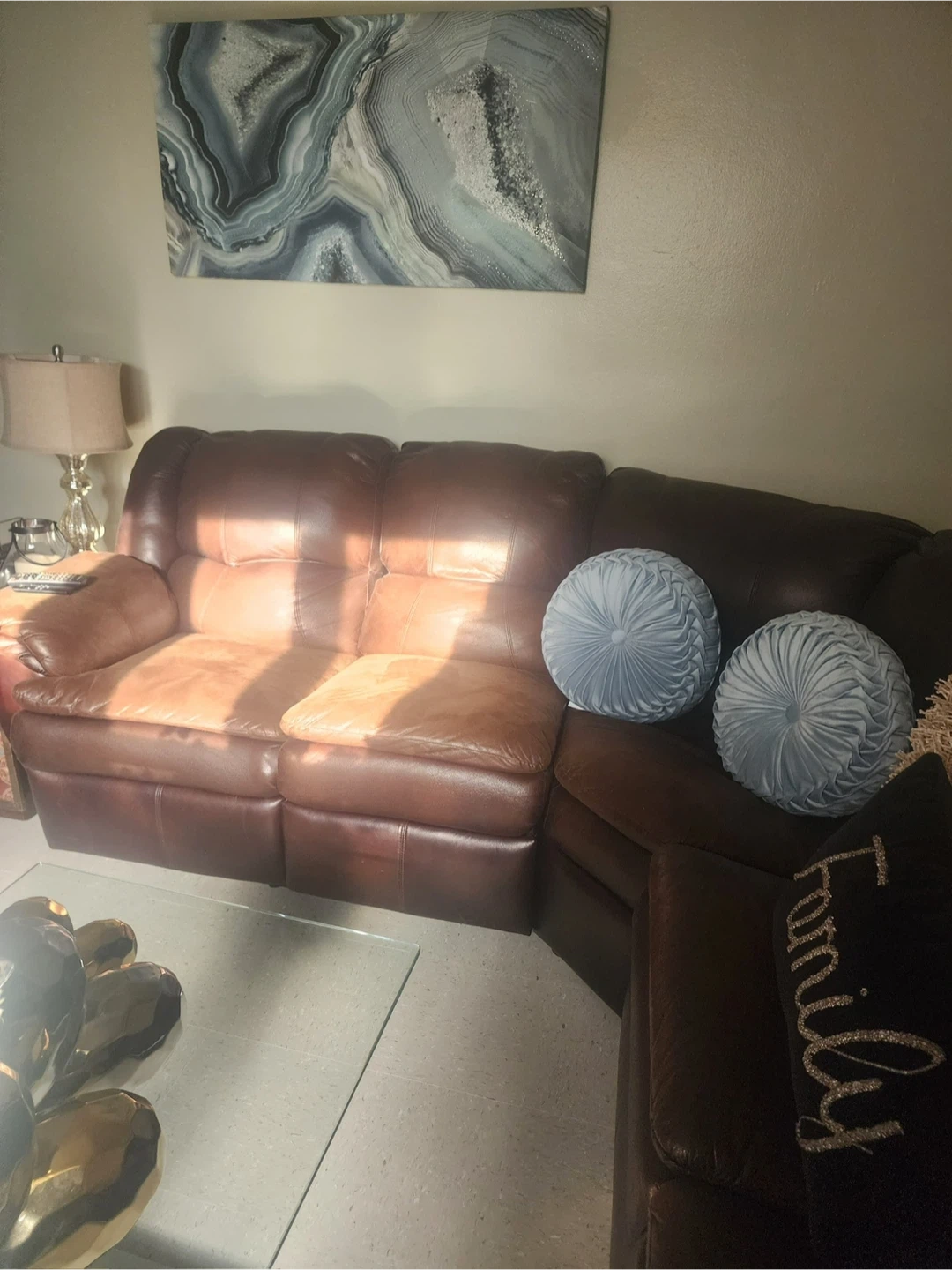 Selling a comfortable brown leather sectional sofa. It's in good condition and ready for a new home. Perfect for a living room or entertainment area. The leather is soft and the cushions are plush, making it a great place to relax
